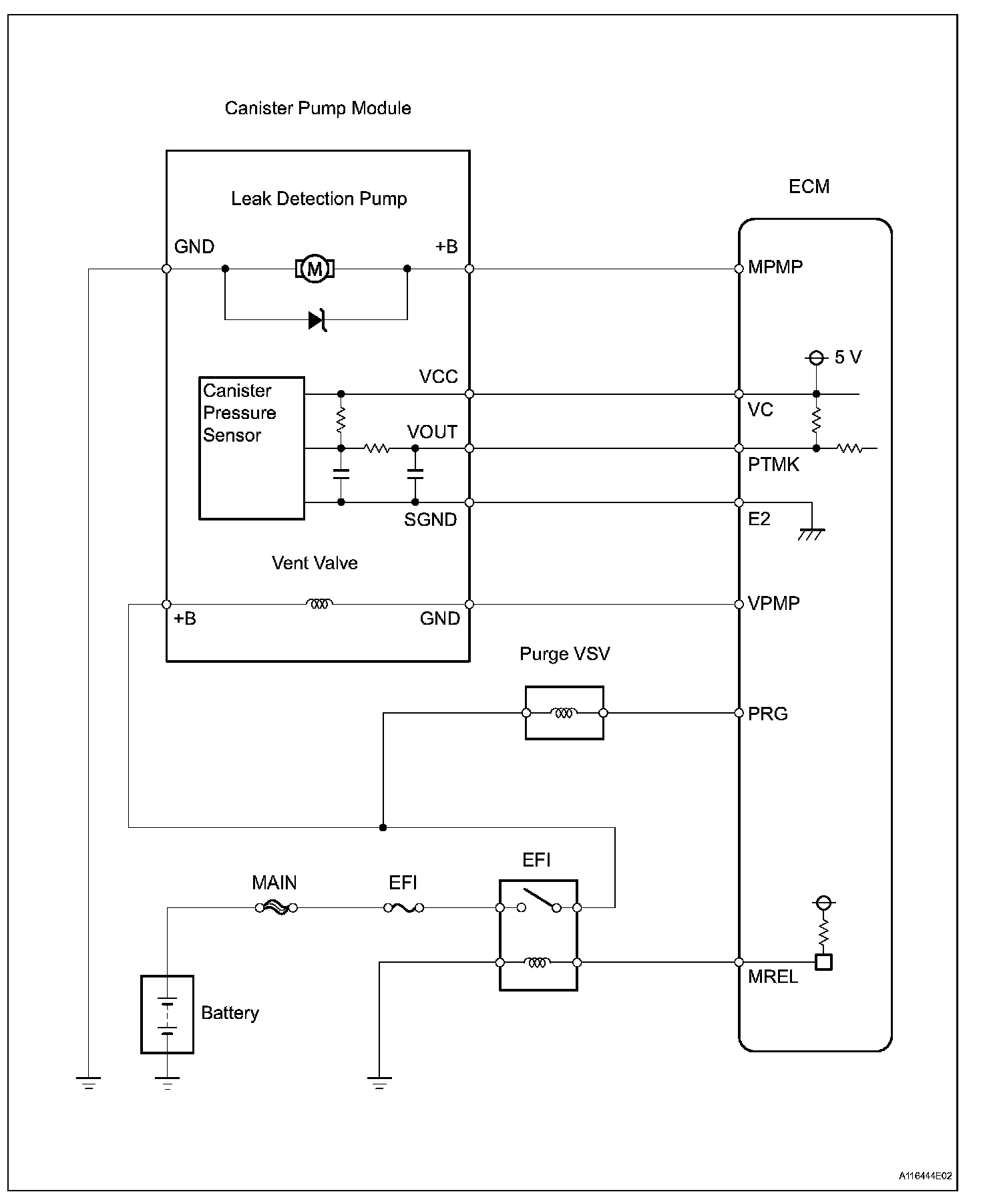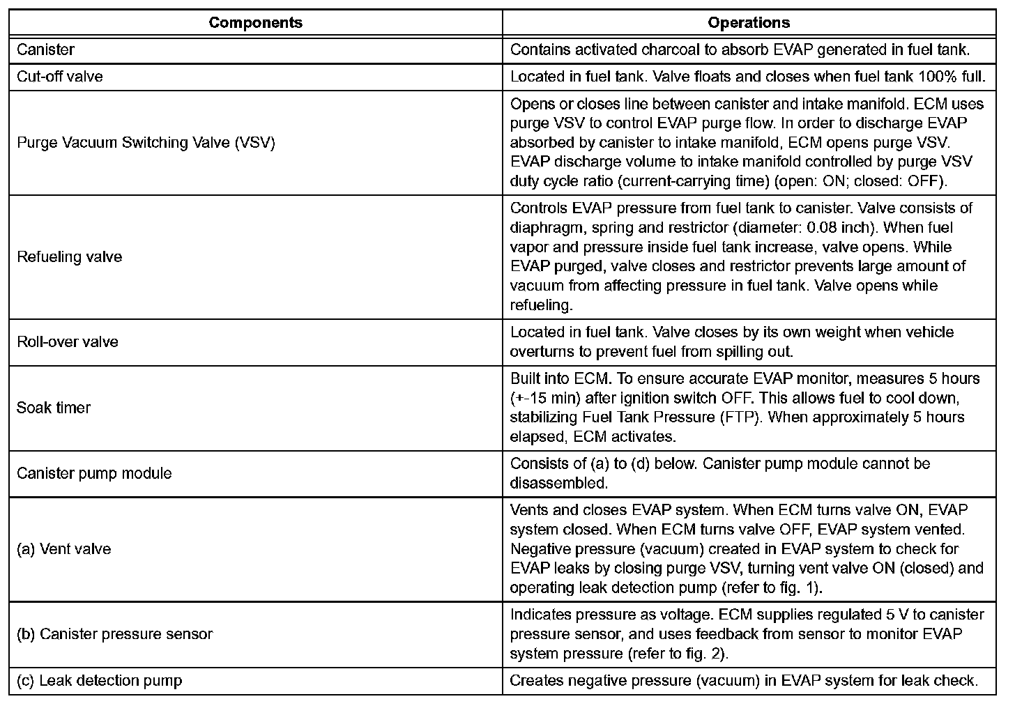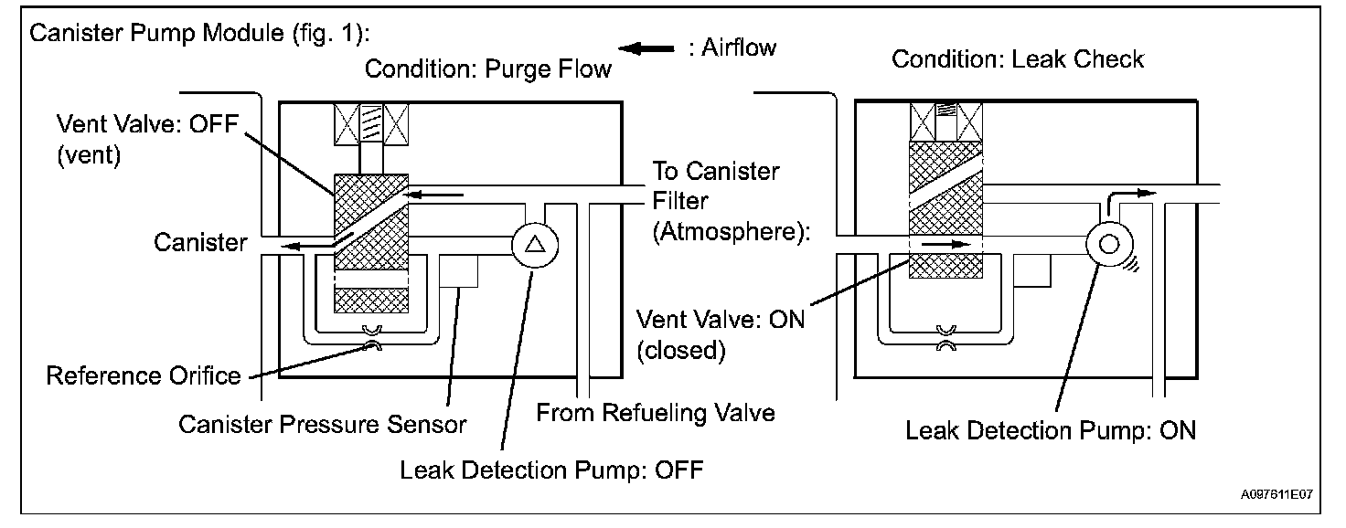 The leak detection pump creates negative pressure (vacuum) in the EVAP system and the pressure is measured. Finally, the ECM monitors for leaks from the EVAP system and malfunctions in both the canister pump module and purge VSV, based on the EVAP pressure.