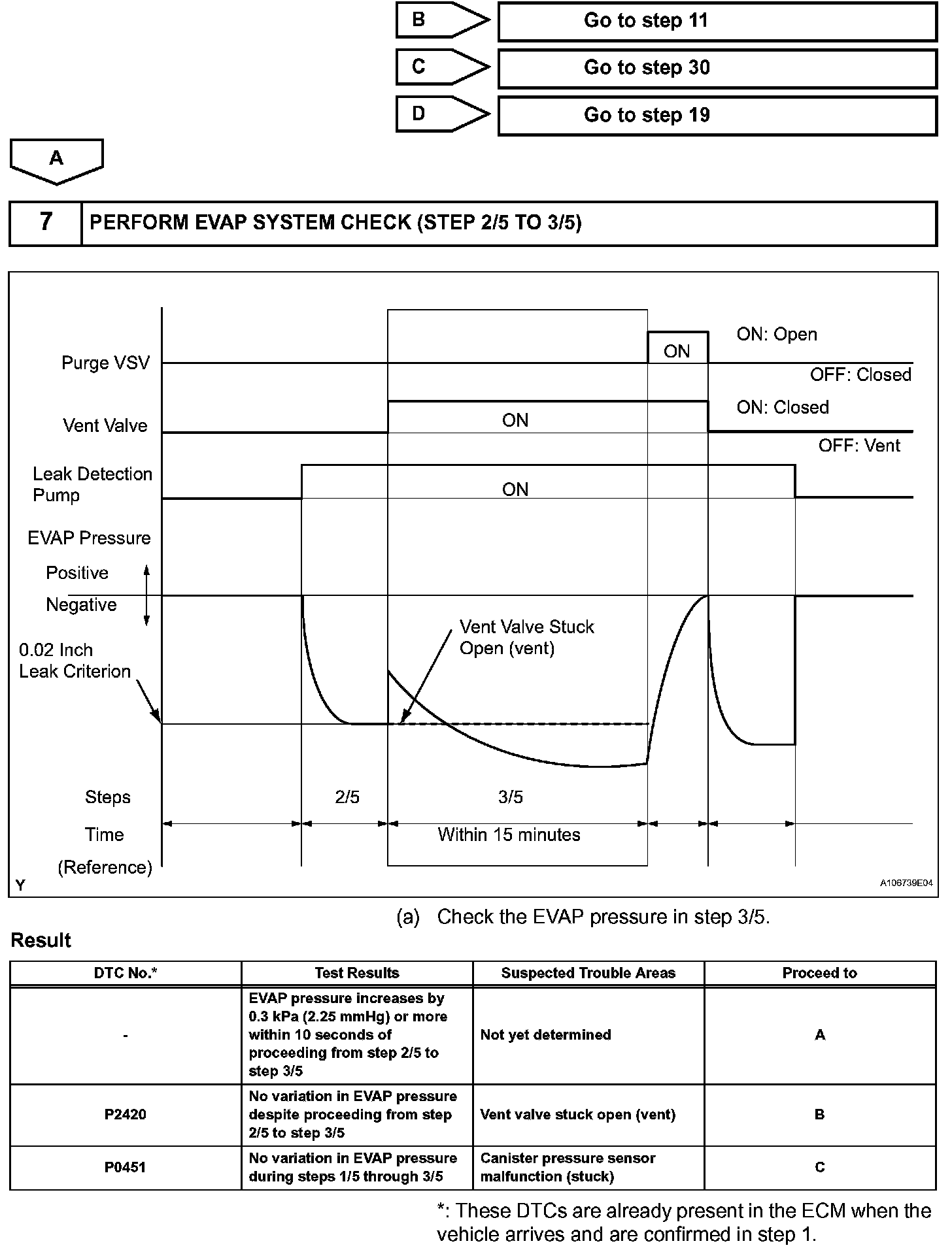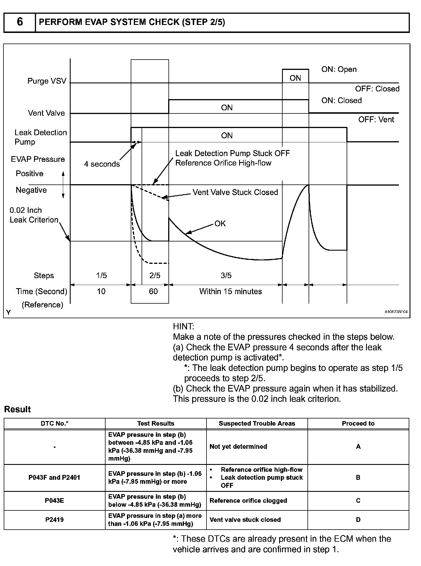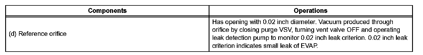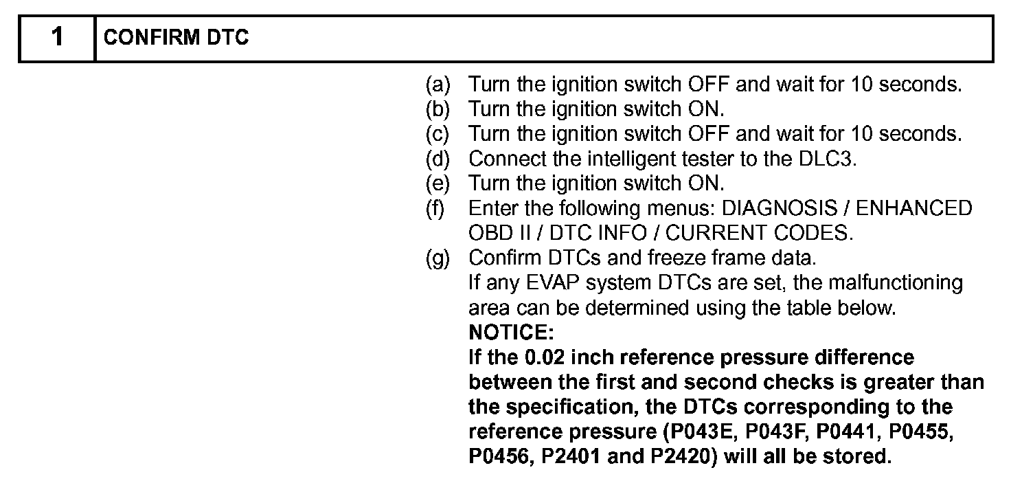 NOTE: If the 0.02 inch reference pressure difference between the first and second checks is greater than the specification, the DTCs corresponding to the reference pressure (P043E, P043F, P0441, P0455, P0456, P2401 and P2420) will all be stored.