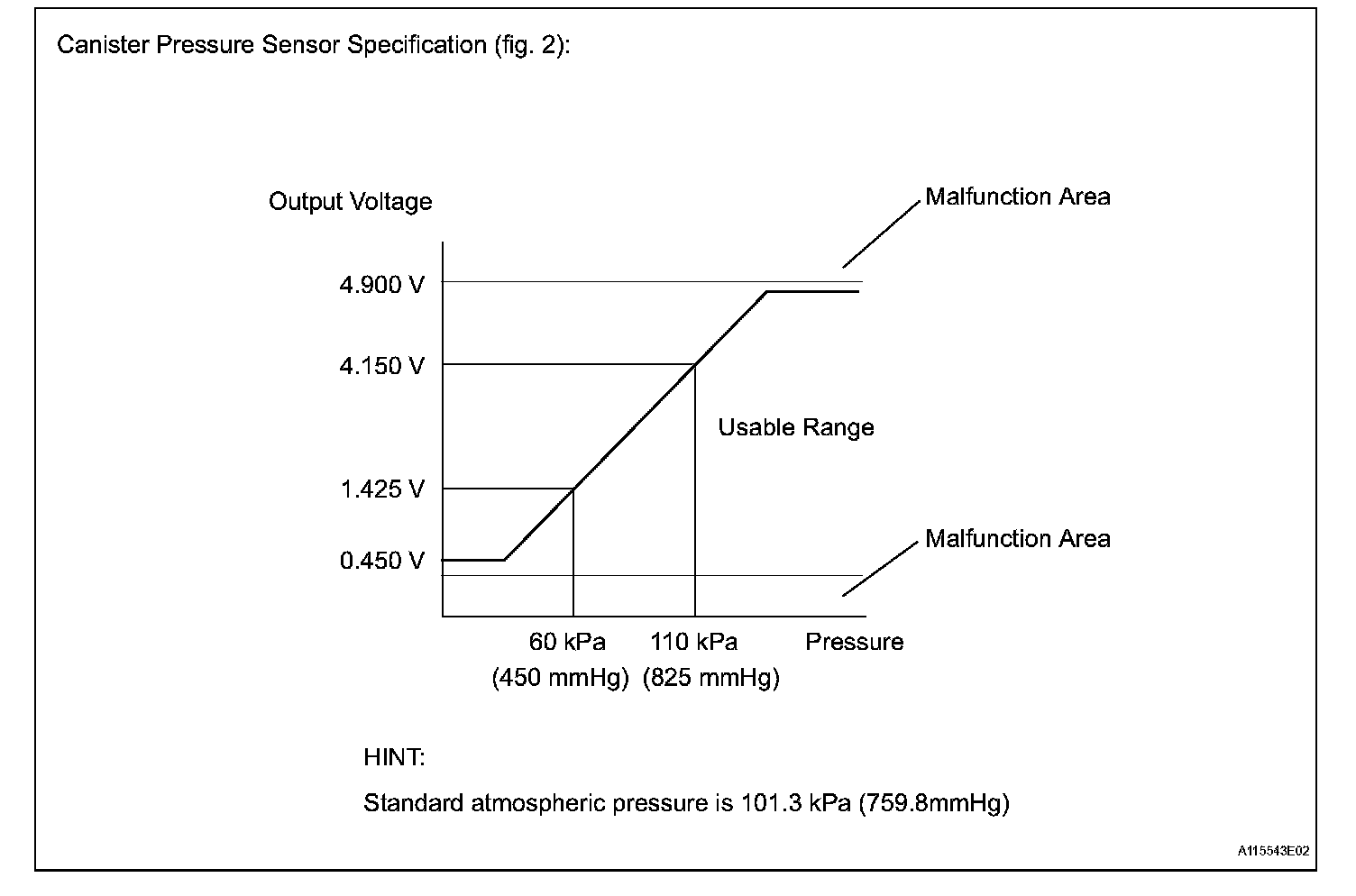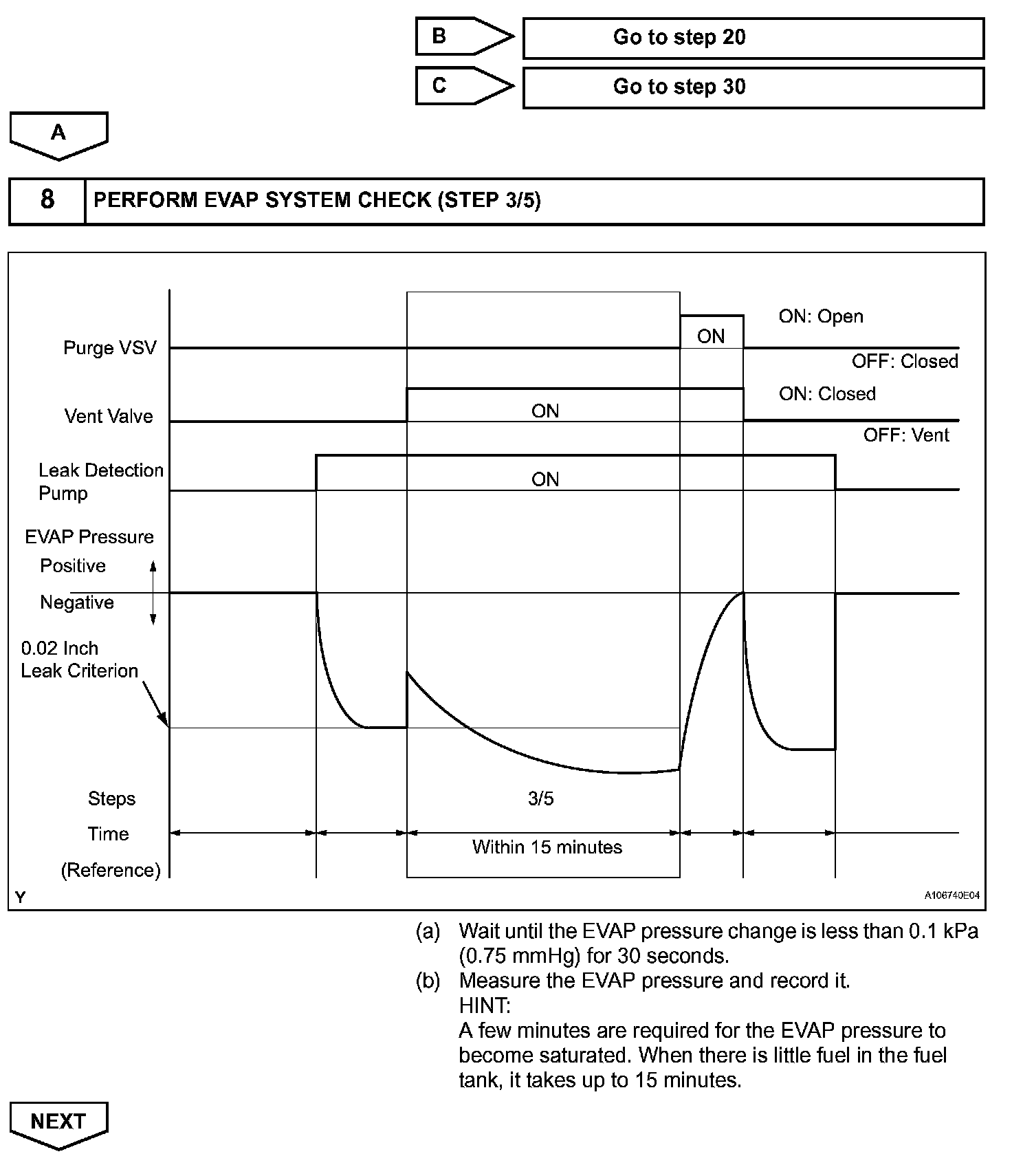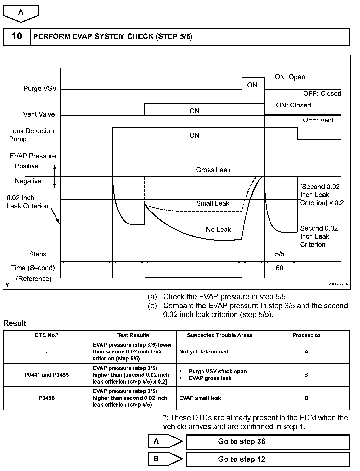 NOTE: If the 0.02 inch reference pressure difference between the first and second checks is greater than the specification, the DTCs corresponding to the reference pressure (P043E, P043F, P0441, P0455, P0456, P2401 and P2420) will all be stored.