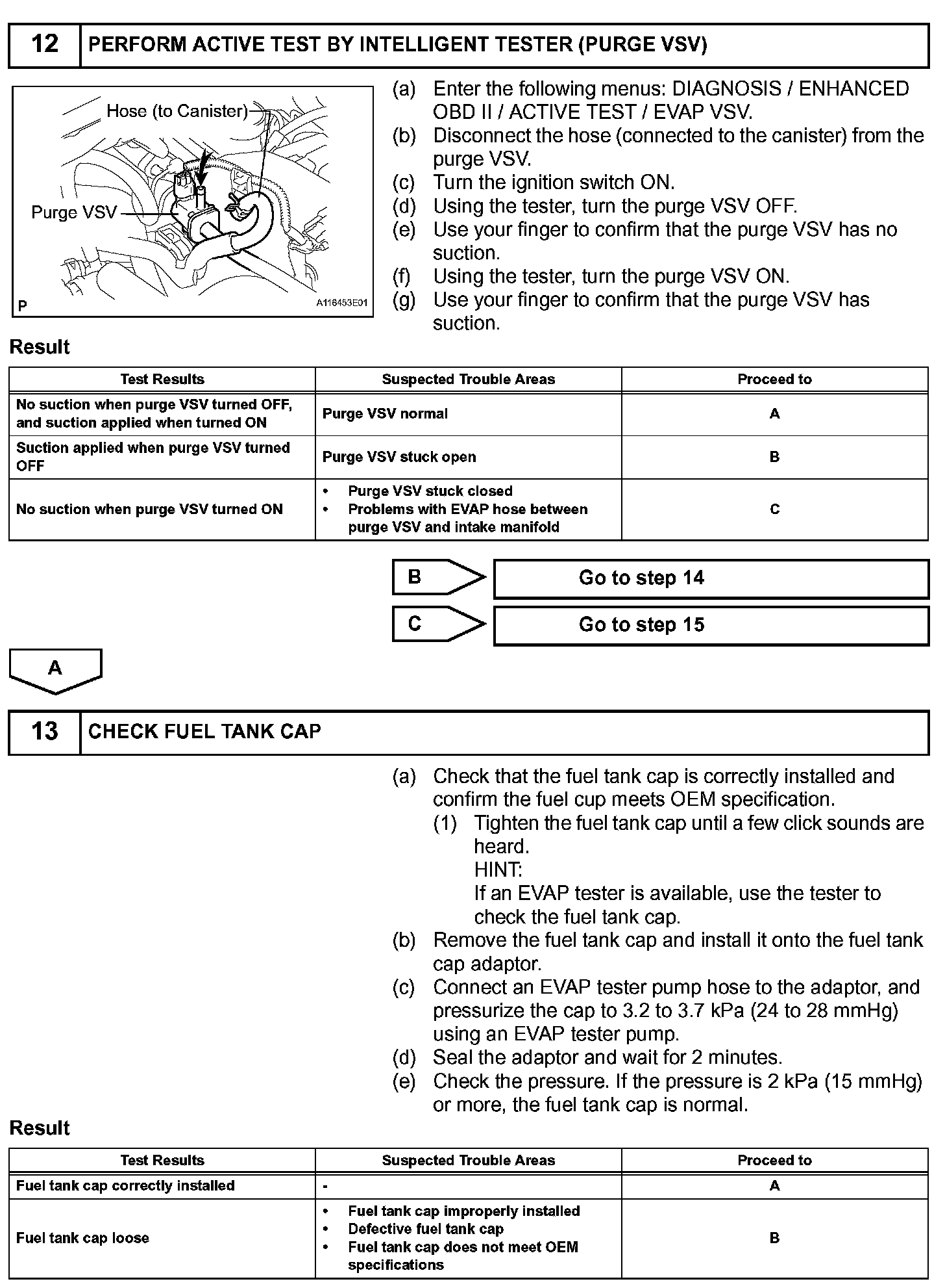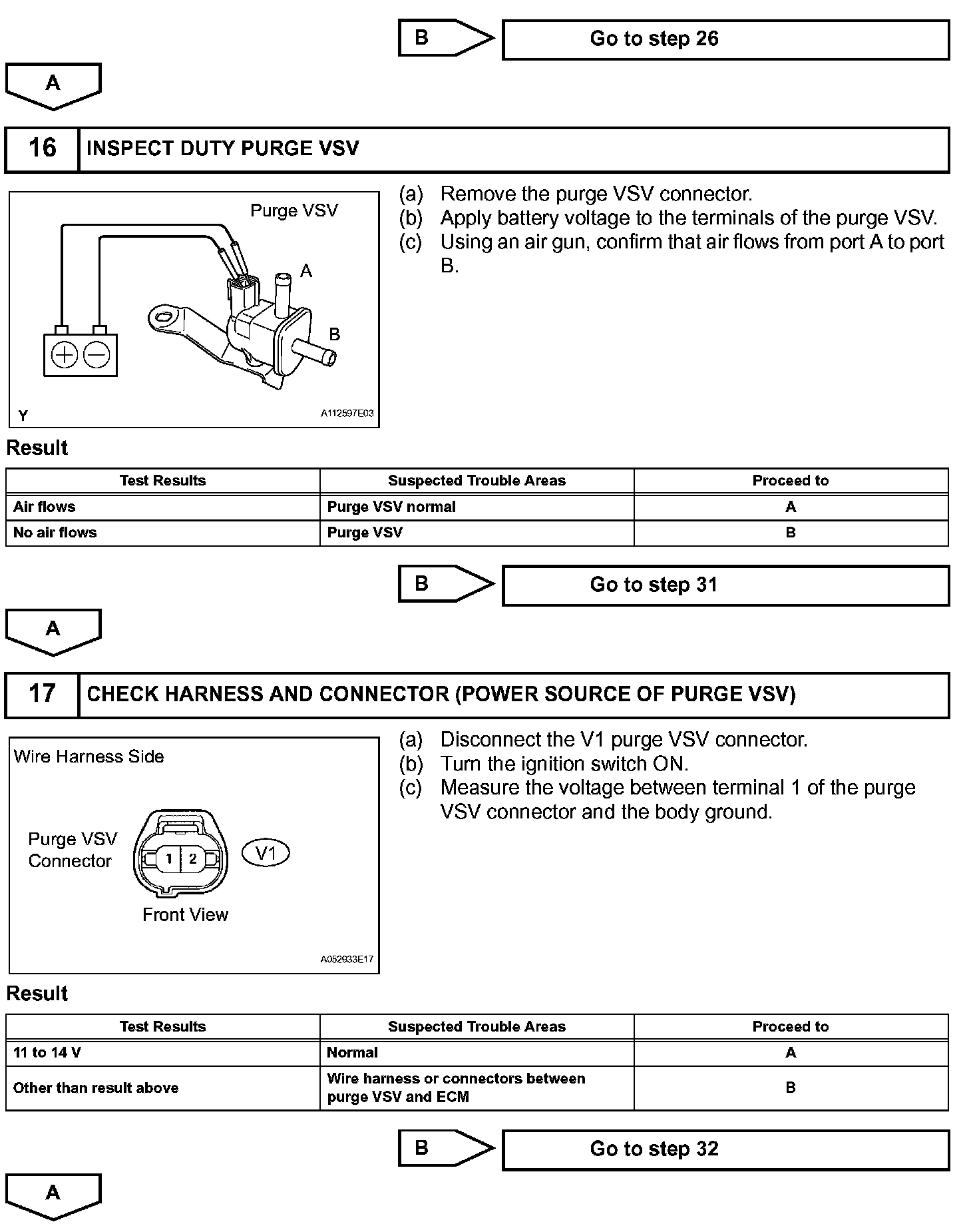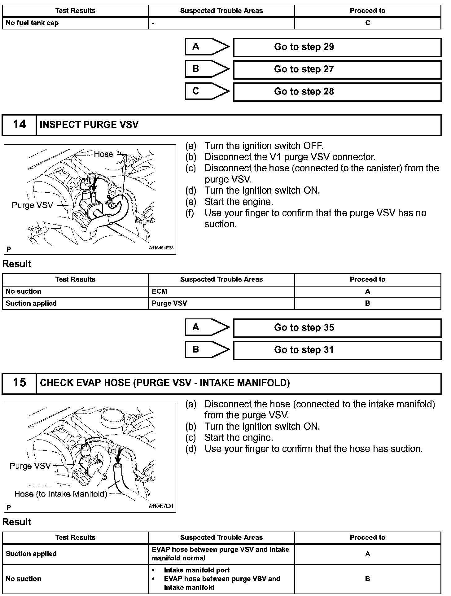 While the engine is running, if a predetermined condition (closed loop, etc.) is met, the purge VSV is opened by the ECM and stored fuel vapors in the canister are purged to the intake manifold. The ECM changes the duty cycle ratio of the purge VSV to control purge flow volume.