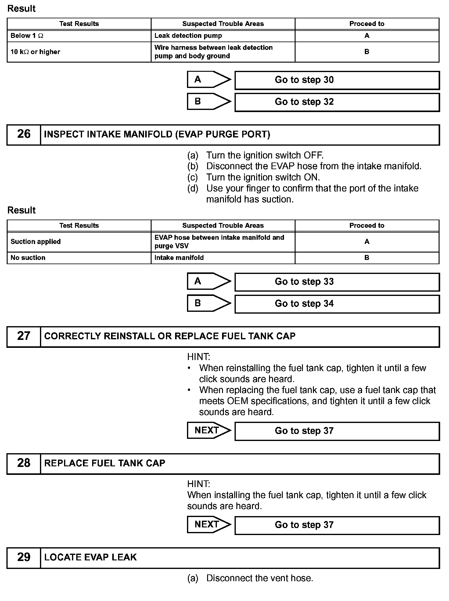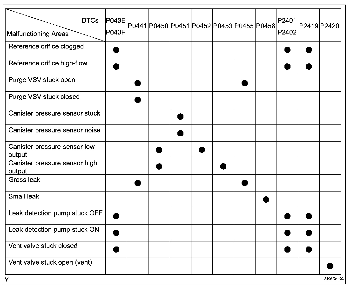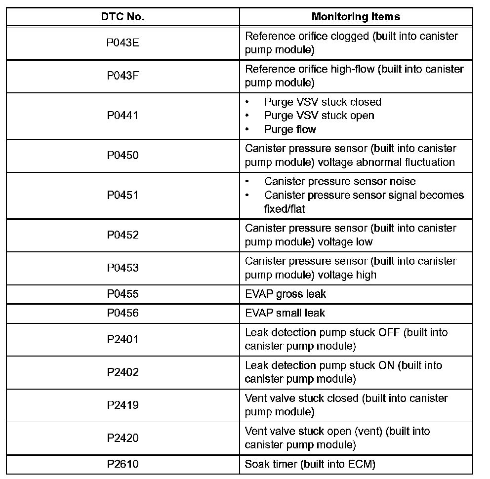 If any EVAP system DTCs are set, the malfunctioning area can be determined using the table given.