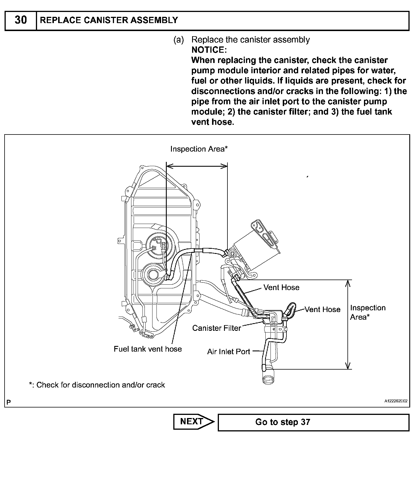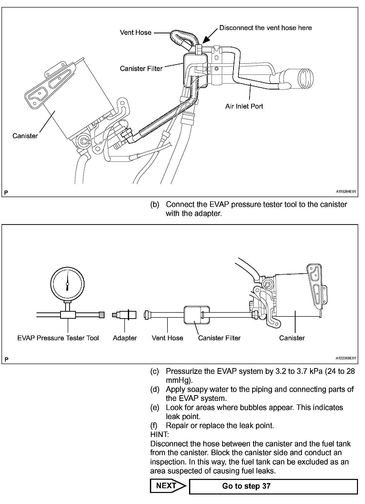 NOTE: In this vehicle's EVAP system, turning ON the vent valve does not seal off the EVAP system. To check for leaks in the EVAP system, disconnect the air inlet vent hose and apply pressure from the atmosphere side of the canister.
