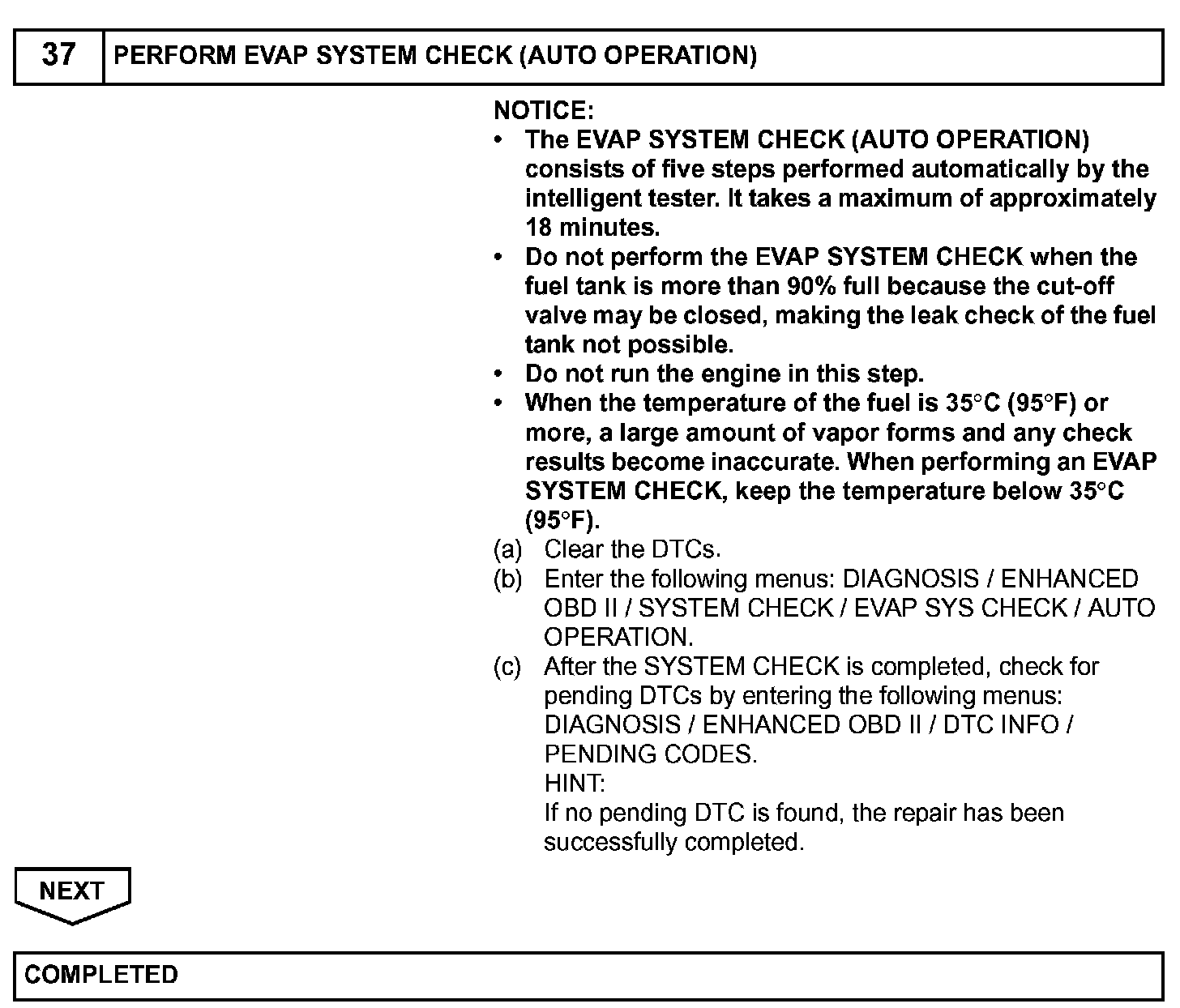 HINT: *: If the engine coolant temperature is not below 35 degrees C (95 degrees F) 5 hours after the ignition switch is turned OFF, the monitor check starts 2 hours later. If it is still not below 35 degrees C (95 degrees F) 7 hours after the ignition switch is turned OFF, the monitor check starts 2.5 hours later.