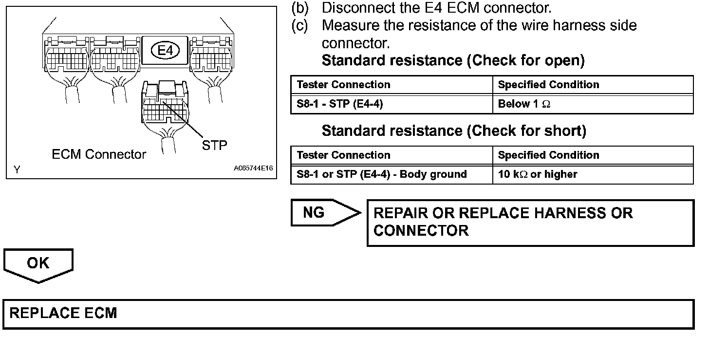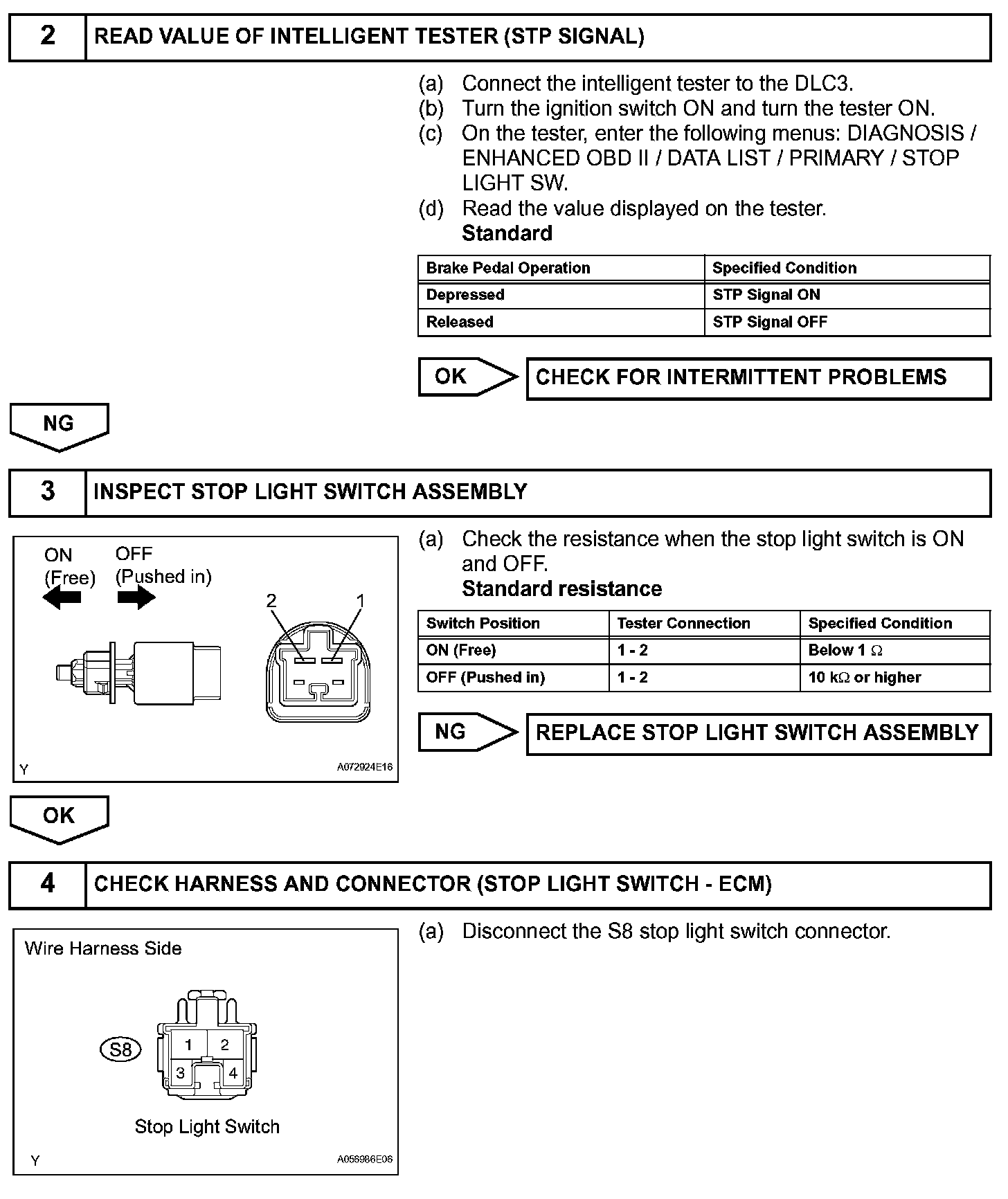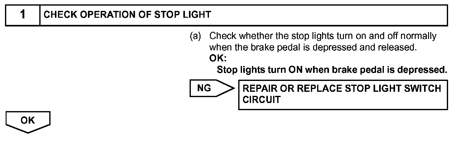 When the brake pedal is depressed, the stop light switch turns on and transmits an STP signal to the ECM. Upon receipt of the STP signal, the ECM determines that the brakes have been applied. The signal voltage level is the same as that of the voltage which is applied to the stop lights. In addition, the STP signal is used to control the fuel cut-off engine speed. Therefore, the fuel cut-off engine speed is slightly reduced when the vehicle is braking.