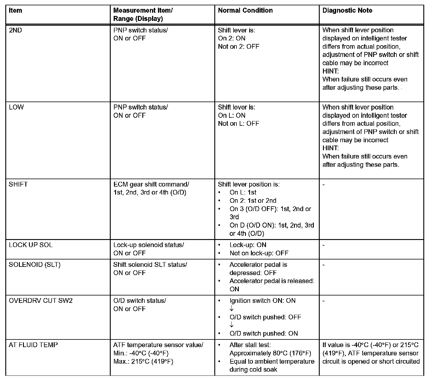 HINT: Using the intelligent tester's DATA LIST allows switch, sensor, actuator, and other item values to be read without removing any parts. Reading the DATA LIST early in troubleshooting is one way to save time.