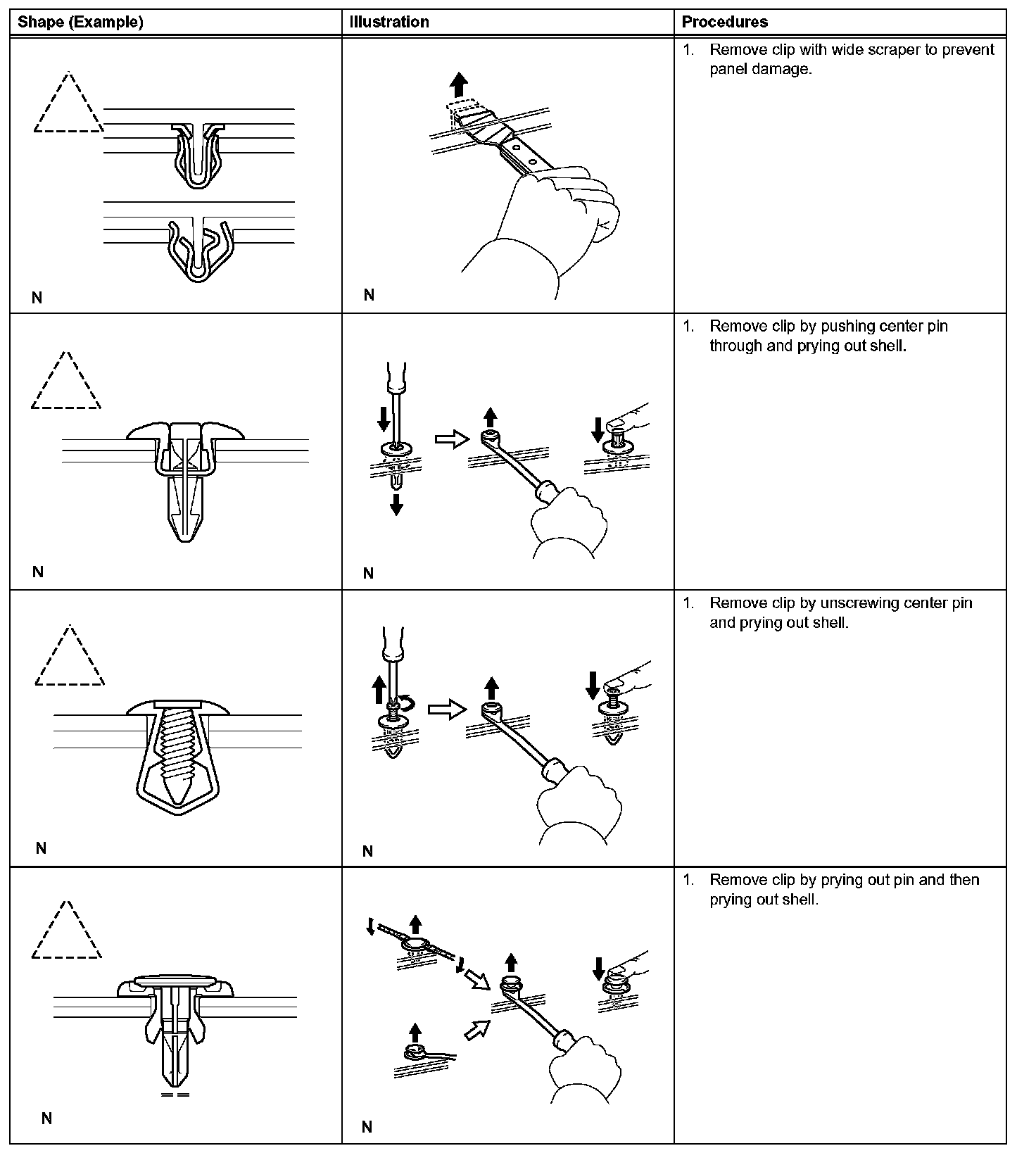1. The removal and installation methods of typical clips used for vehicle body parts are shown in the table.