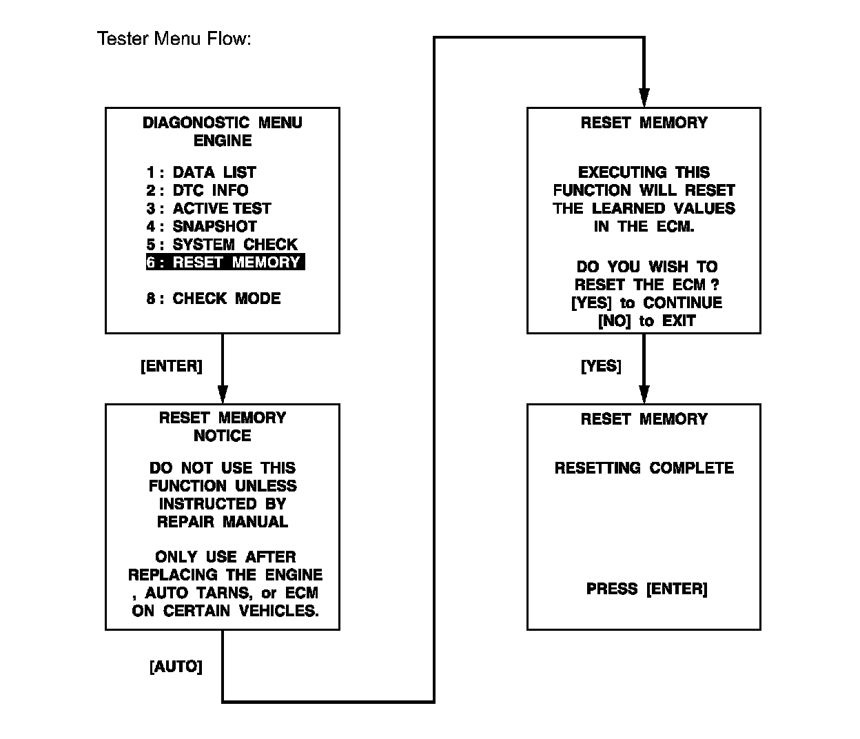 CAUTION: After performing the RESET MEMORY procedures, be sure to perform the ROAD TEST as described earlier. Road Test