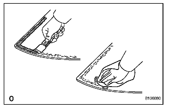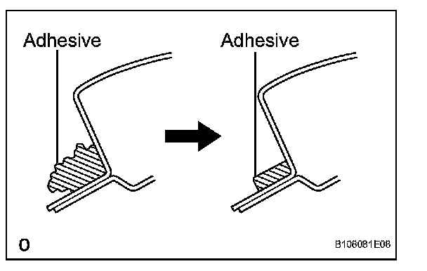 1. On the contact surface of the vehicle body, use a knife to cut away excess adhesive as shown in the illustration.