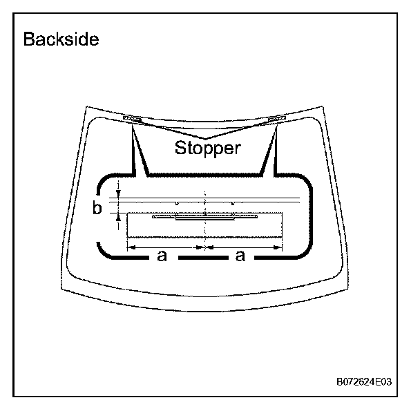 b. Remove the peeling paper from the adhesive part of the dam. Install the dam (adhesive side) to the window glass (Primer G area), but exclude the stopper areas.