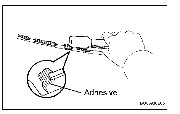 NOTE: Leave as much adhesive on the vehicle body as possible when cutting through the adhesive.