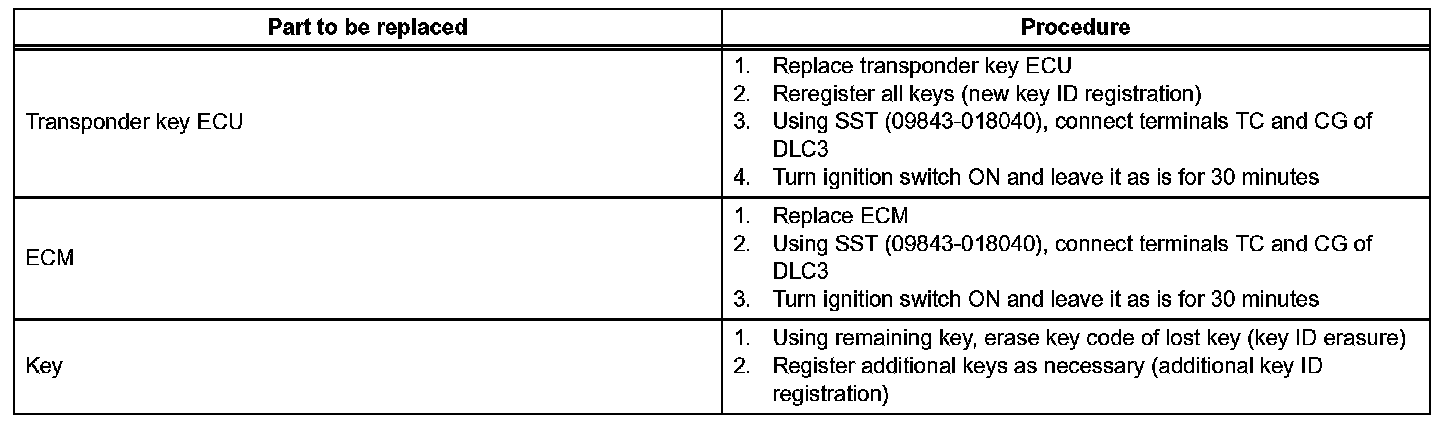 a. The given table shows ECU replacement and key registration procedures in case the malfunctioning ECU has been specified after troubleshooting the engine immobilizer system.