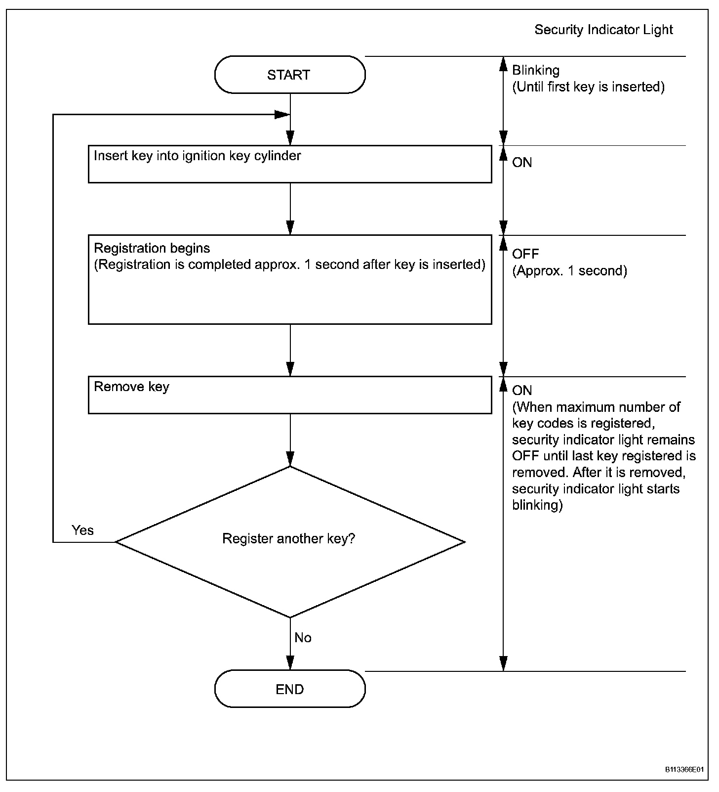 - When no key is inserted into the ignition key cylinder in automatic key code registration mode, the security indicator light remains ON.