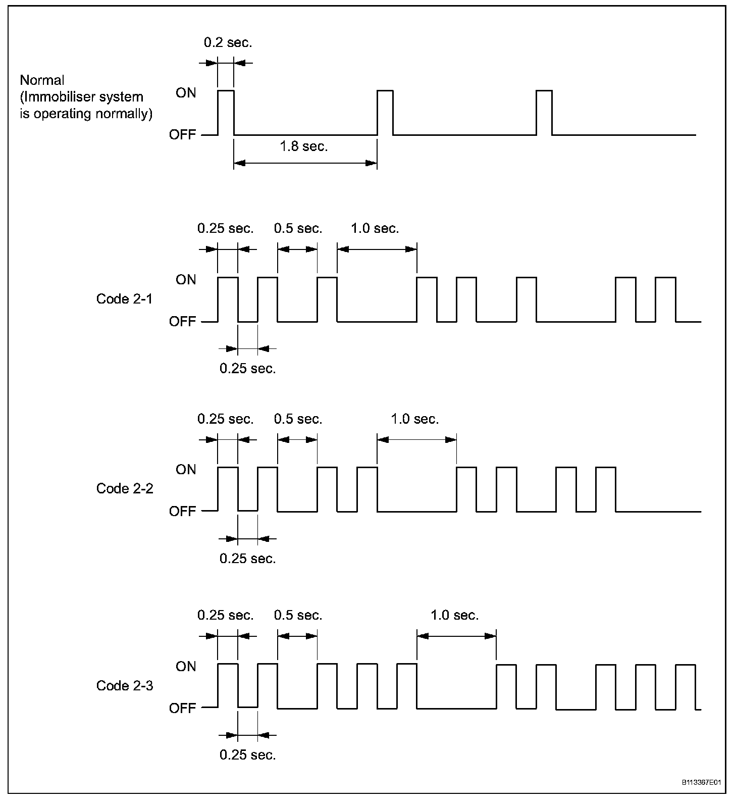 - If the key code registration has failed in automatic key code registration mode, code 2-1 will be output from the security indicator light. Trying to reregister an already registered key will cause code 2-2 to be output when the key is inserted. If the number of registered key codes exceeds the limit, code 2-3 will be output from the security indicator light. The output details are shown given.