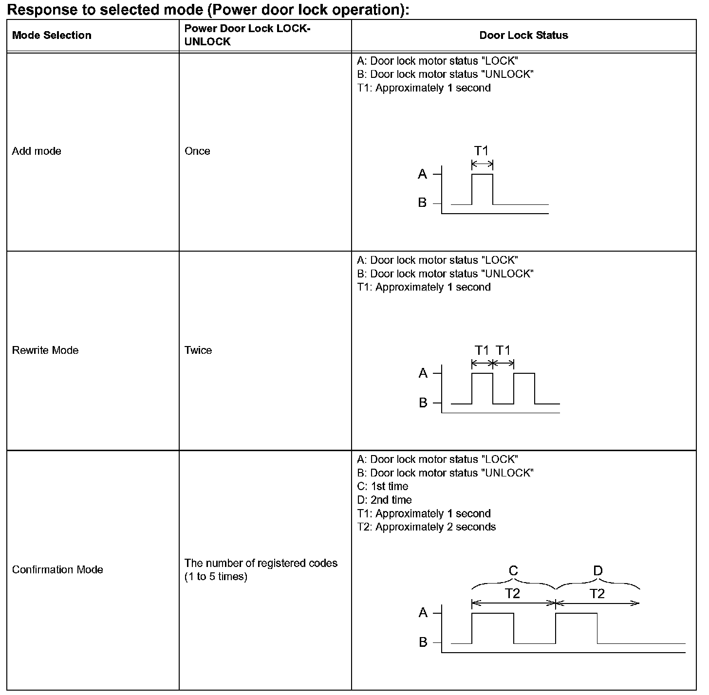HINT: If the number of the ON-LOCK operations of the ignition switch is 0, 4 or 6 or more, there will be no response (power door LOCK-UNLOCK operation) to show which mode has been selected.