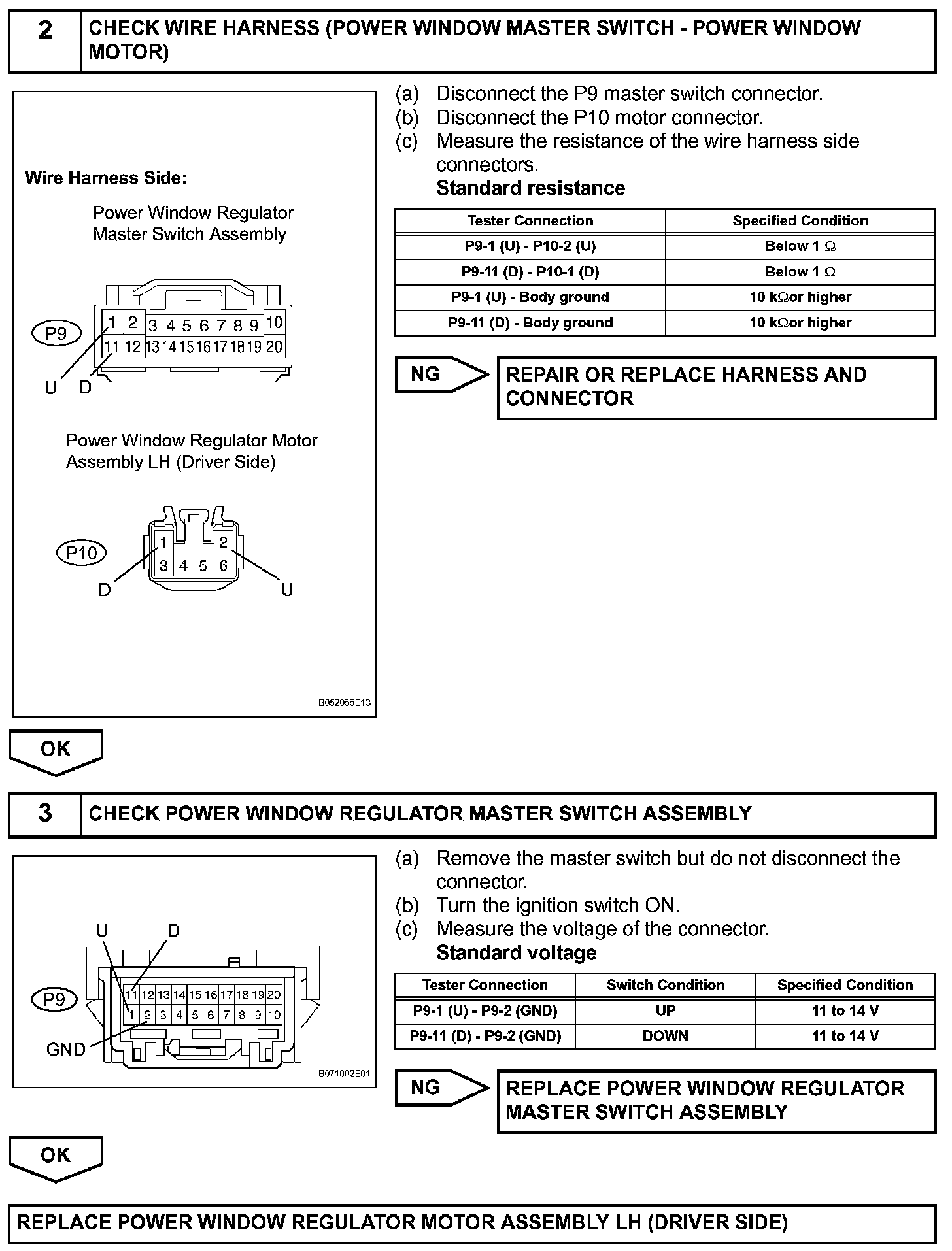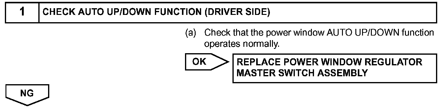 Driver Side Power Window does not Operate with Power Window Master SwitchDESCRIPTIONIf the manual UP/DOWN function does not operate, a malfunction may be present in the power window regulator motor, the power window regulator master switch or the wire harness.