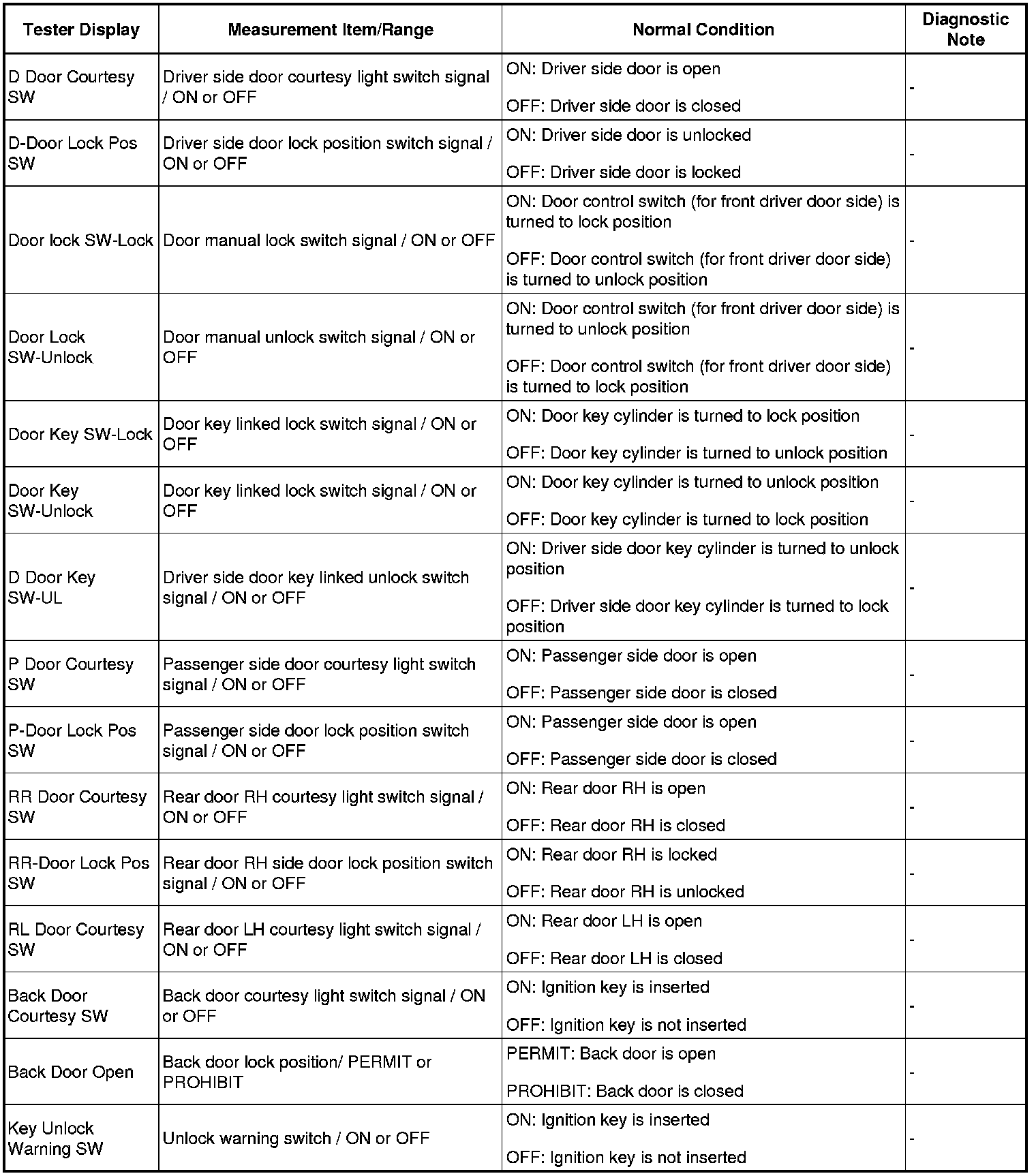NOTE: In the table below, the values listed under Normal Condition are reference values. Do not depend solely on these reference values when deciding whether a part is faulty or not.