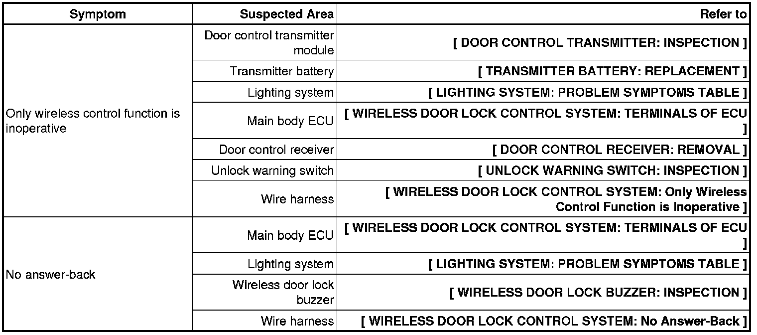 DOOR LOCK: WIRELESS DOOR LOCK CONTROL SYSTEM: PROBLEM SYMPTOMS TABLE