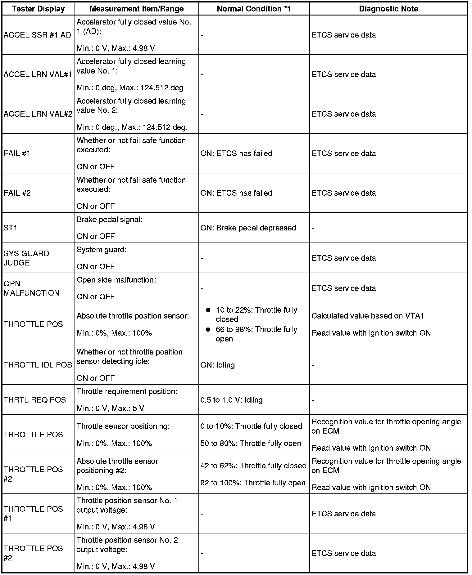 NOTE: In the table below, the values listed under Normal Condition are reference only. Do not depend solely on these values when determining whether or not a part is faulty.