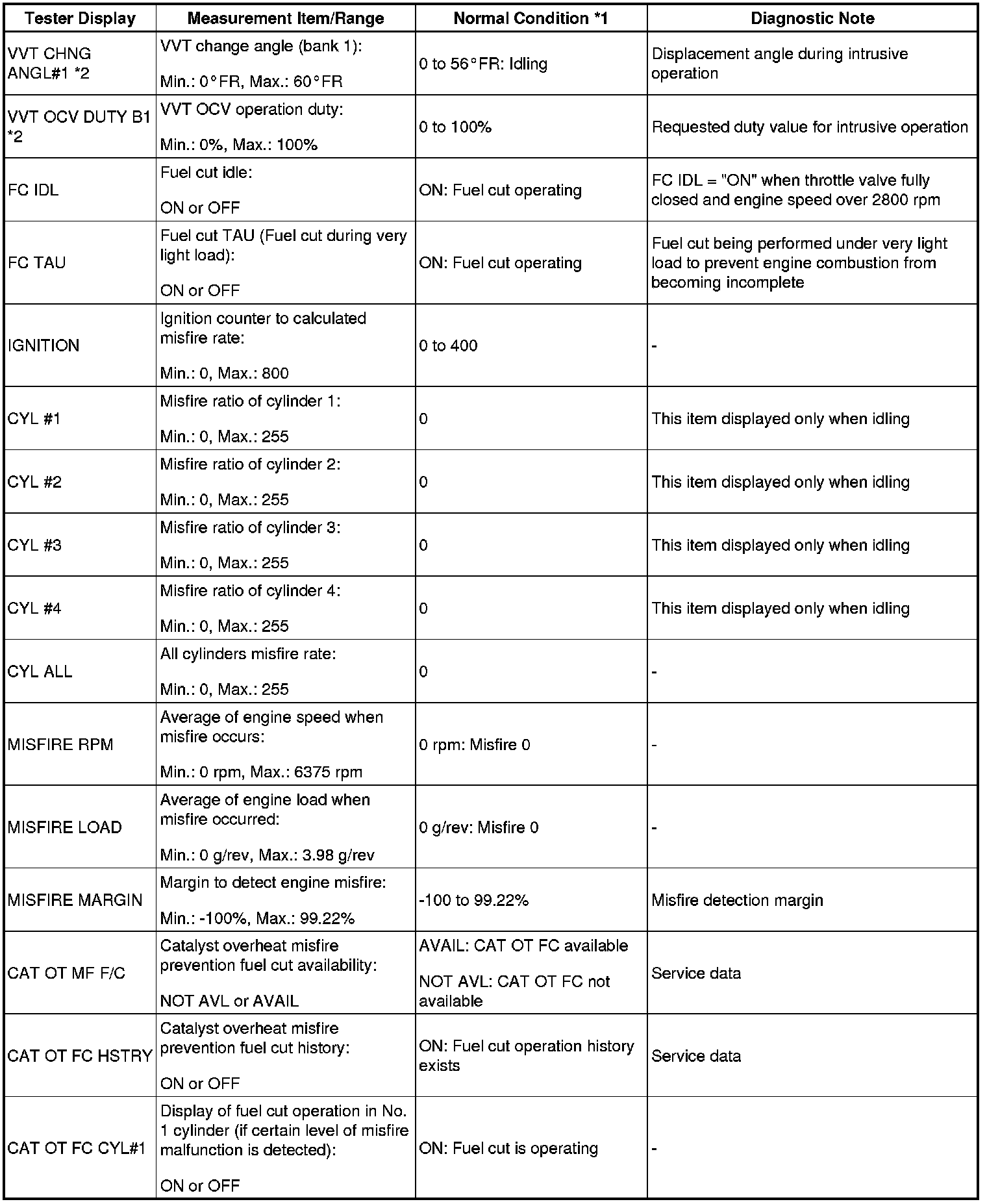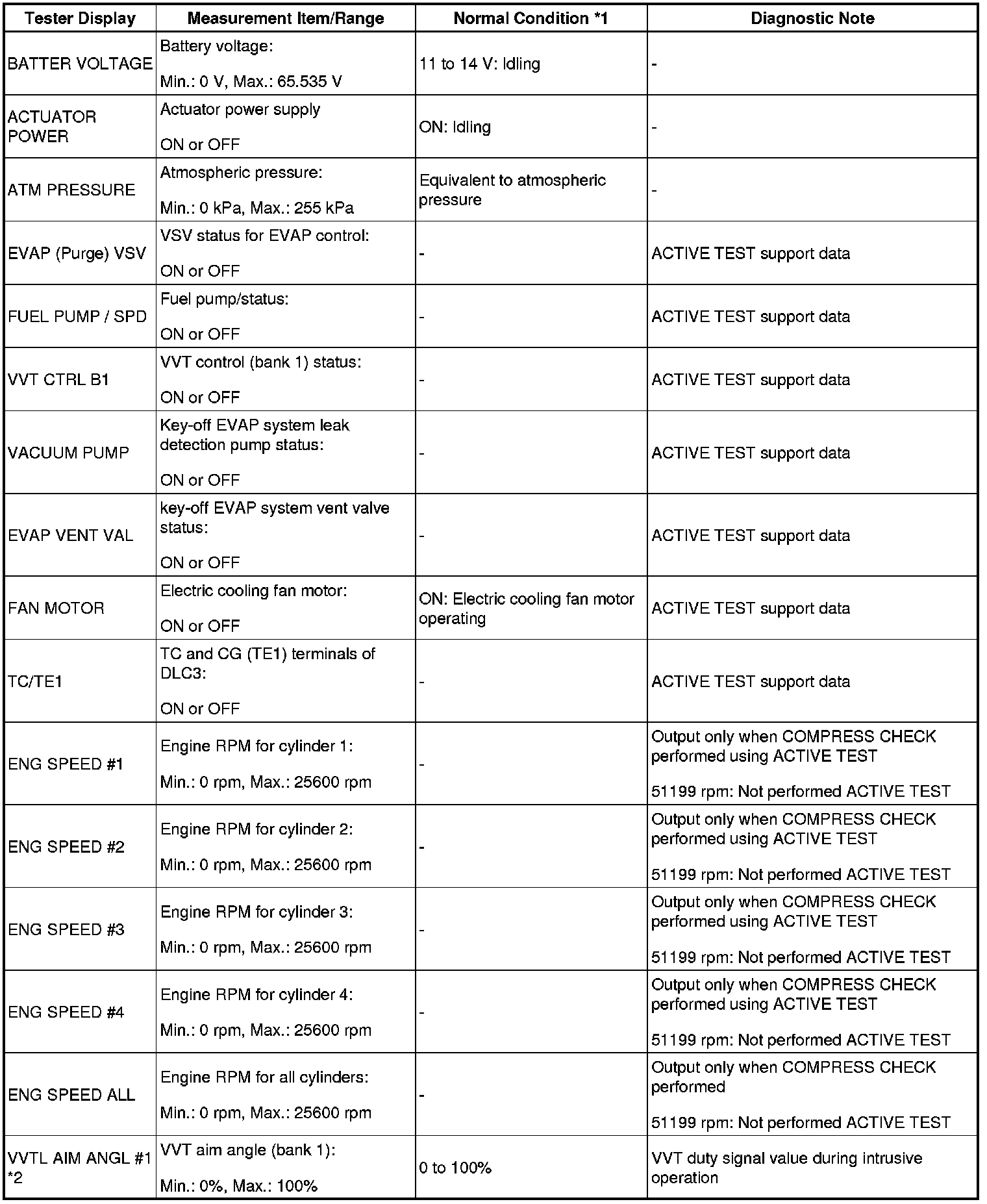 - *2: Values are only displayed when performing the ACTIVE TEST: VVT B1. For other ACTIVE TESTs, the DATA LIST value will be 0.