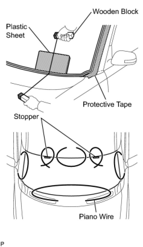 - To prevent the safety pad from being scratched when removing the windshield glass, place a plastic sheet between the piano wire and safety pad.