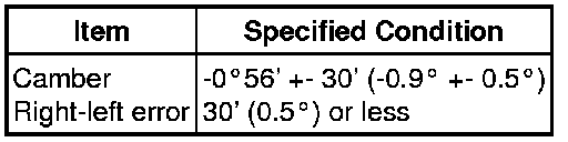 * If the measured value is not within the specified range, inspect the suspension parts for damage and/or wear and replace them if necessary because camber is not adjustable.