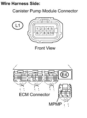 (d) Measure the resistance between the MPMP terminal of the ECM connector and the 1 terminal of the canister pump module connector.