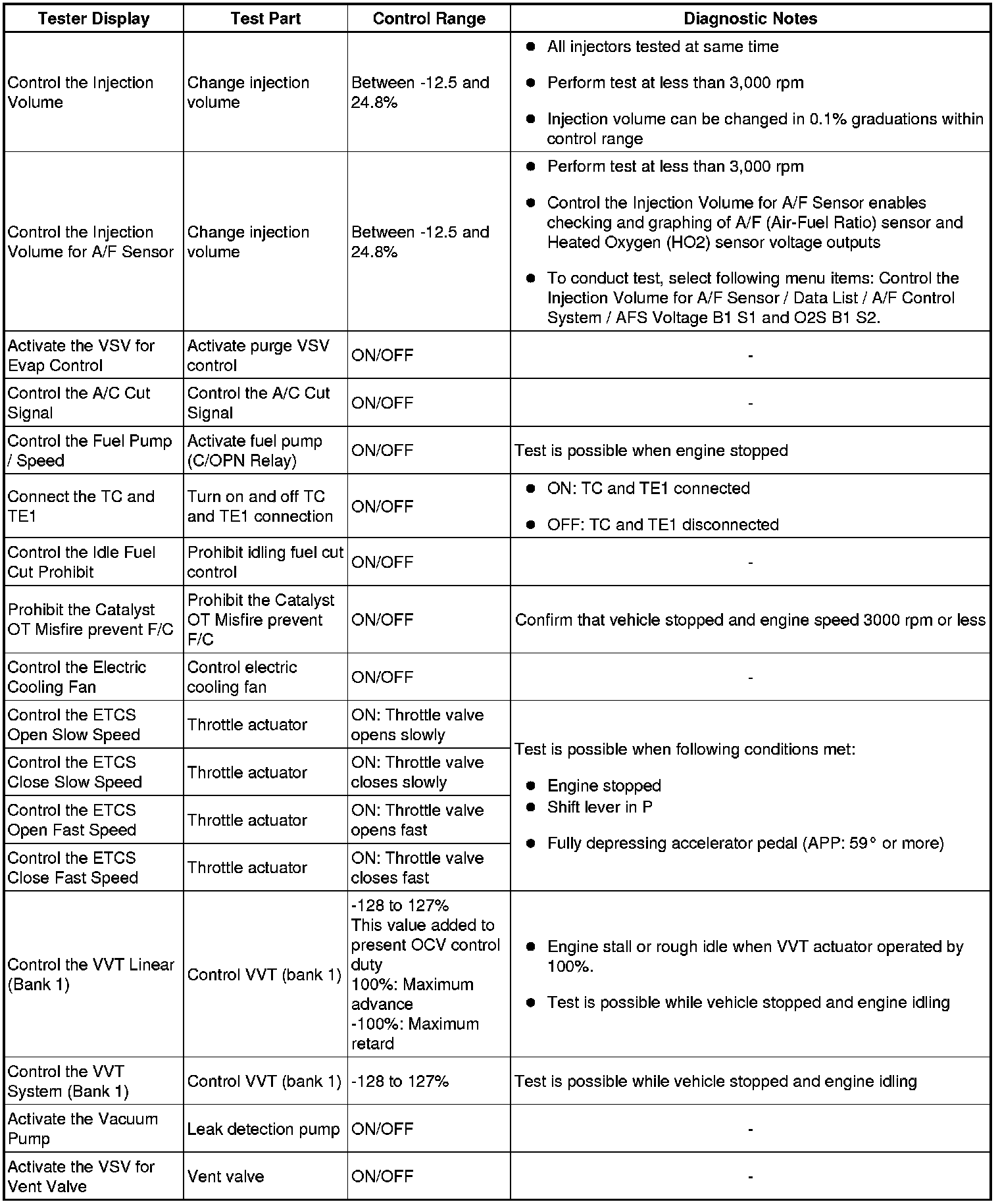 (e) Perform the Active Test by referring to the table below.