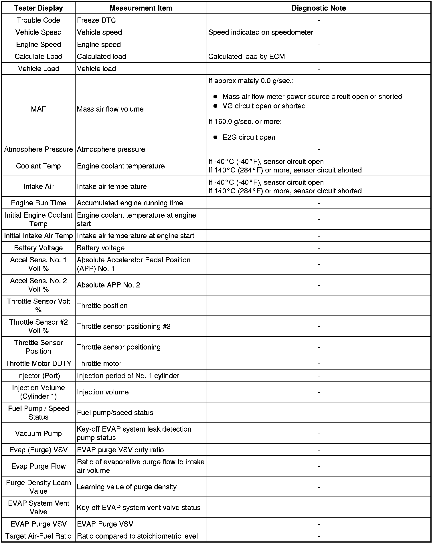 * The ECM records vehicle and driving condition information as freeze frame data when a malfunction is detected. When troubleshooting, it can help determine if the vehicle was running or stopped, the engine was warmed up or not, the air-fuel ratio was lean or rich, and other data from the time the malfunction occurred.