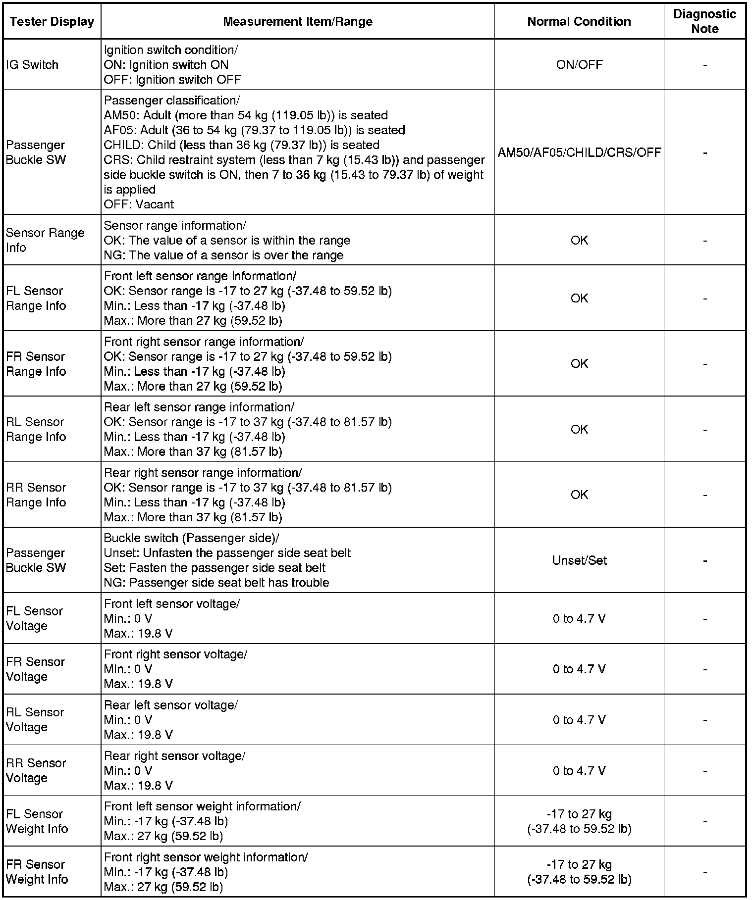 SUPPLEMENTAL RESTRAINT SYSTEM: OCCUPANT CLASSIFICATION SYSTEM: DATA LIST / ACTIVE TEST
