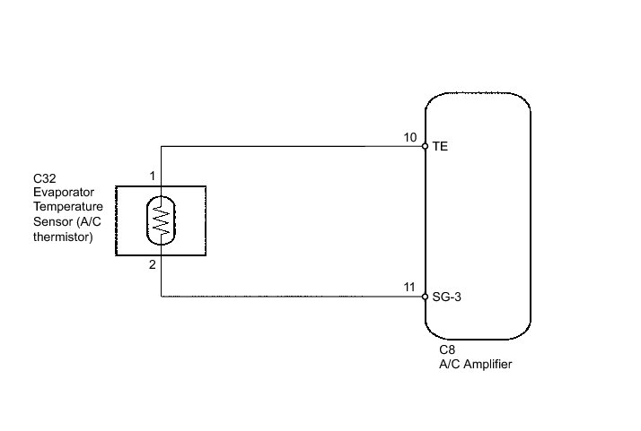The evaporator temperature sensor (A/C thermistor) is installed on the evaporator in the air conditioning unit. It detects the temperature of the cooled air that has passed through the evaporator and its signal is used to control the air conditioning. It sends a signal to the A/C amplifier. The resistance of the evaporator temperature sensor (A/C thermistor) changes in accordance with the temperature of the cooled air that has passed through the evaporator. As the temperature decreases, the resistance increases. As the temperature increases, the resistance decreases.
