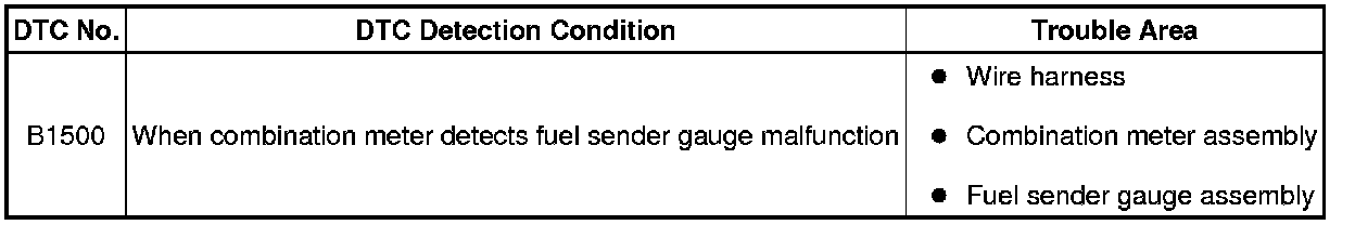 This DTC is output when the combination meter detects the fuel sender gauge malfunction via the CAN.
