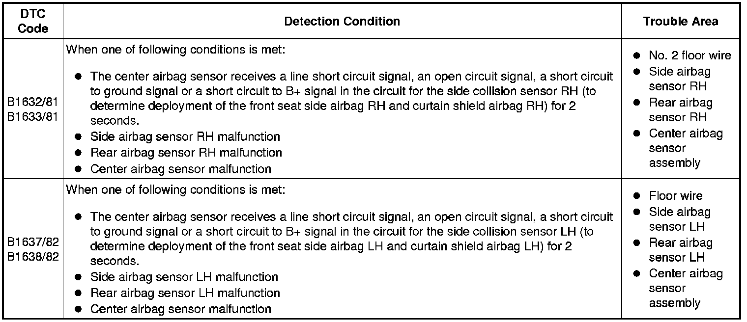 DTC B1632/81, B1633/81, B1637/82 or B1638/82 is recorded when a malfunction is detected in the circuit for the side collision sensor LH or RH (to determine deployment of the front seat side airbag LH or RH and curtain shield airbag LH or RH).