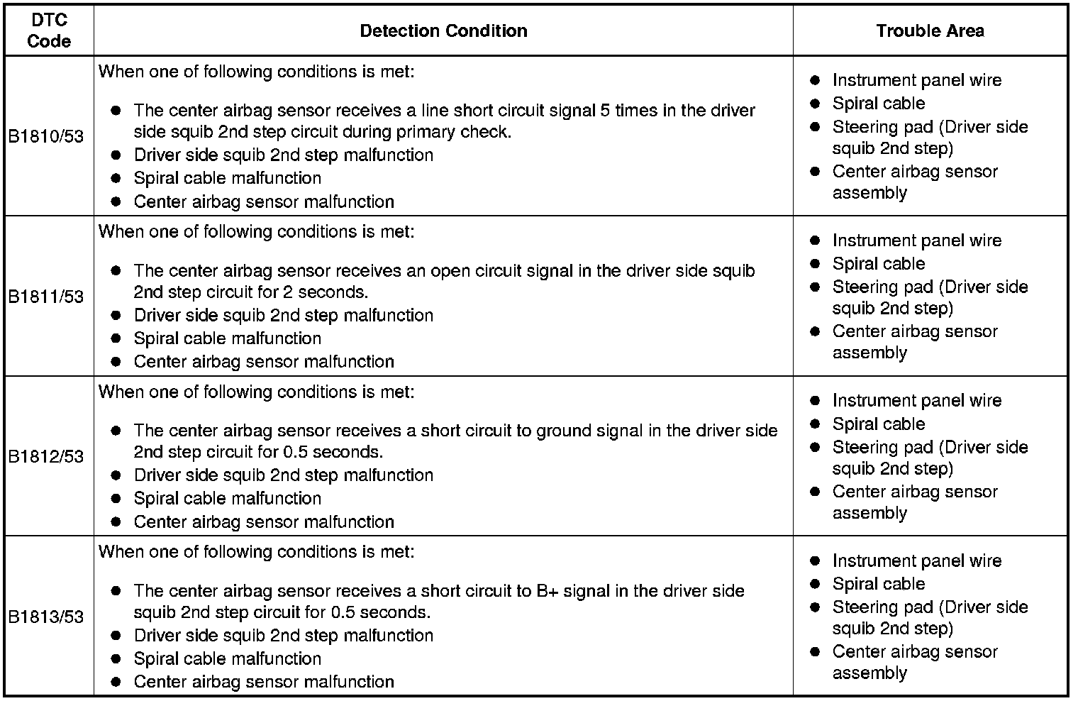These DTCs are recorded when a malfunction is detected in the driver side squib 2nd step circuit.