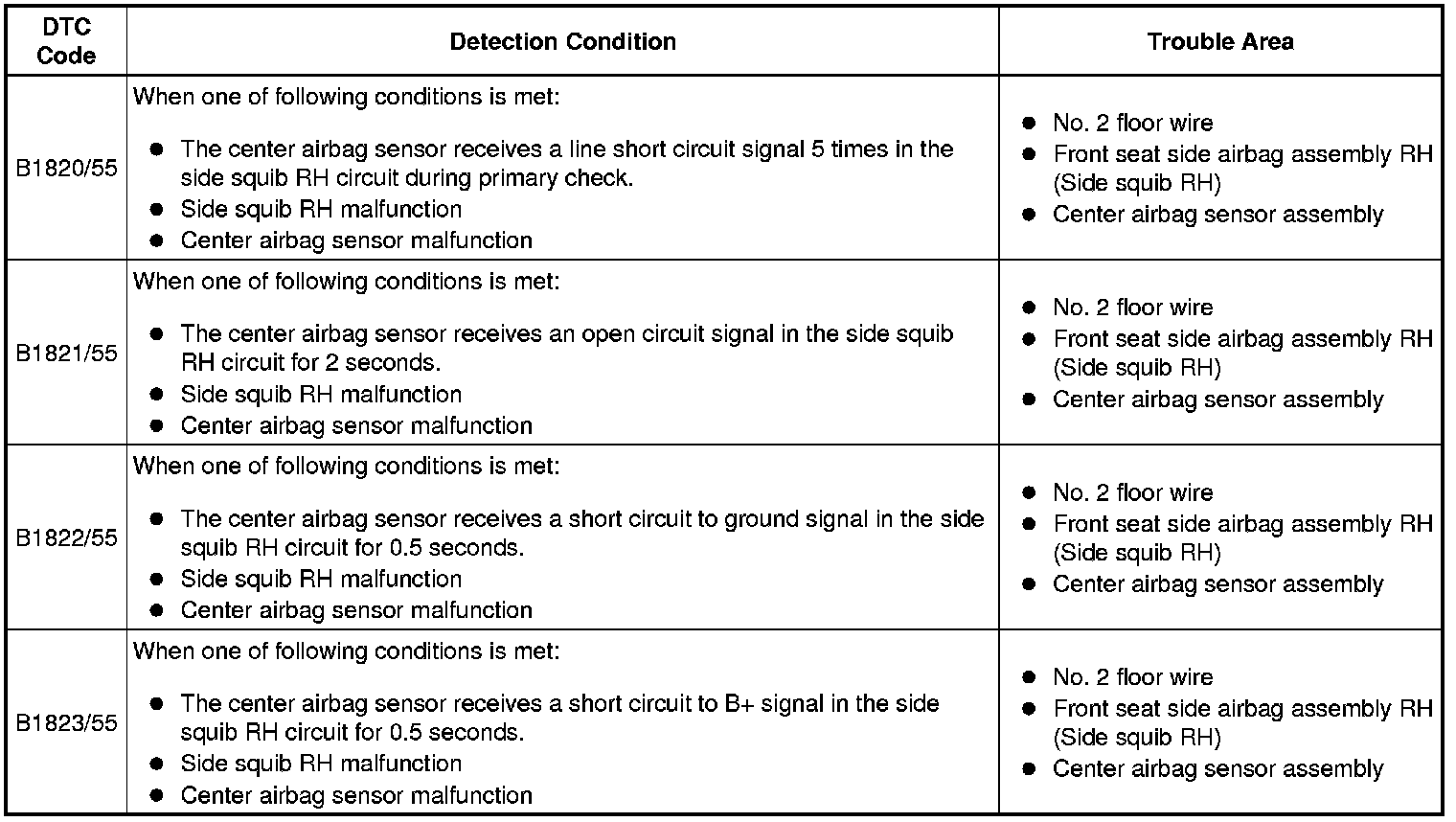 These DTCs are recorded when a malfunction is detected in the side squib RH circuit.
