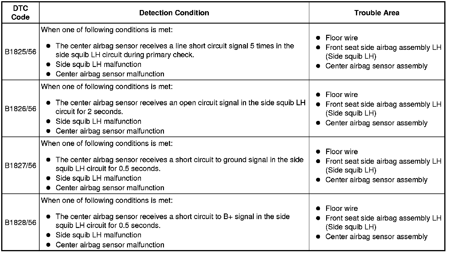 These DTCs are recorded when a malfunction is detected in the side squib LH circuit.