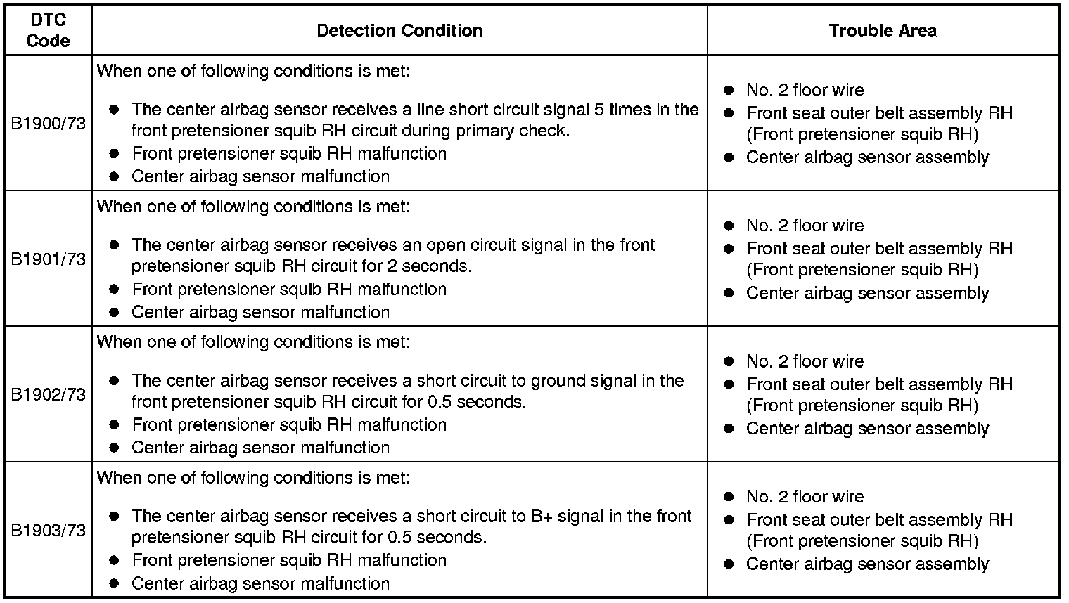These DTCs are recorded when a malfunction is detected in the front pretensioner squib RH circuit.