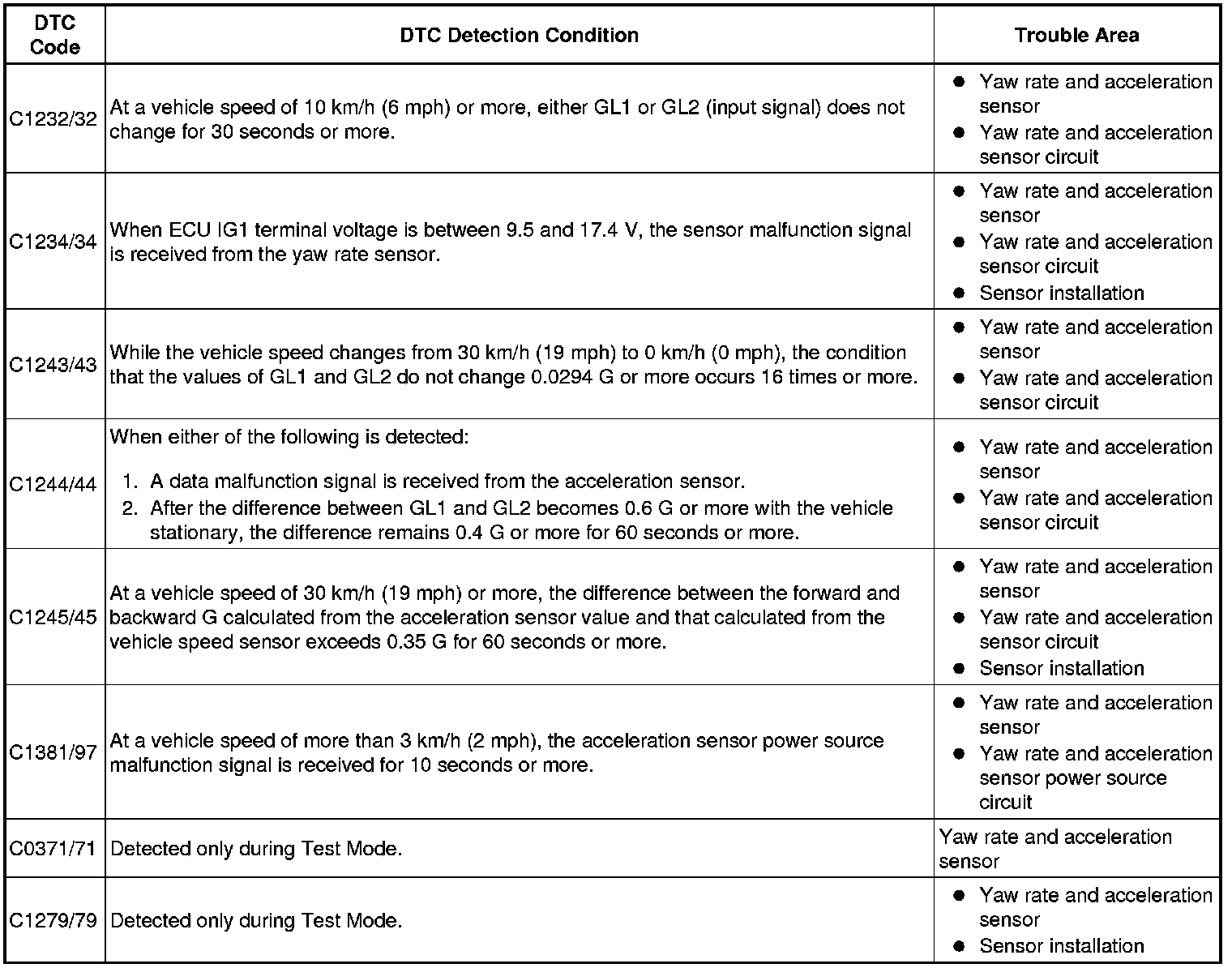 DTCs C0371/71 and C1279/79 can be deleted when the yaw rate and acceleration sensor sends a yaw rate and/or acceleration signal or the Test Mode ends. DTCs C0371/71 and C1279/79 are output only in the Test Mode.