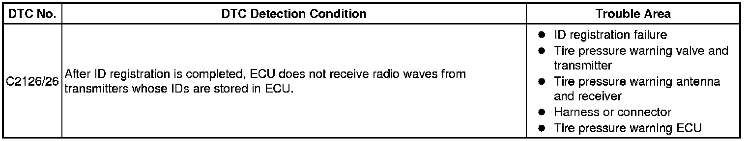 If the IDs stored in the tire pressure warning ECU differ from the transmitter IDs, DTC C2126/26 is set. Check that the IDs in the ECU are the same as the transmitter IDs.