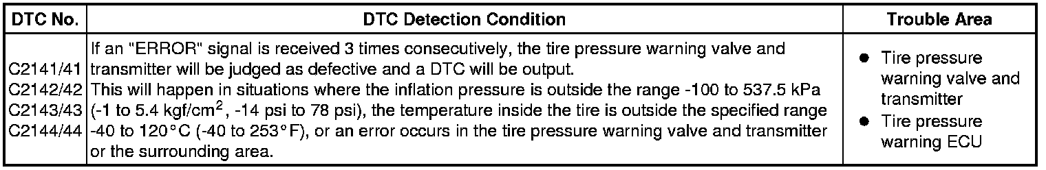 When the internal circuit of a tire pressure warning valve and transmitter is malfunctioning, one of these DTCs is output.