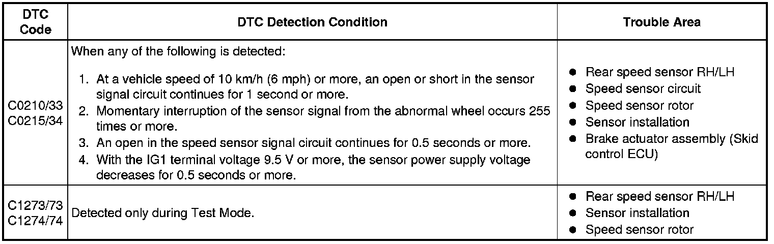 * DTCs C0210/33 and C1273/73 are for the rear speed sensor RH.