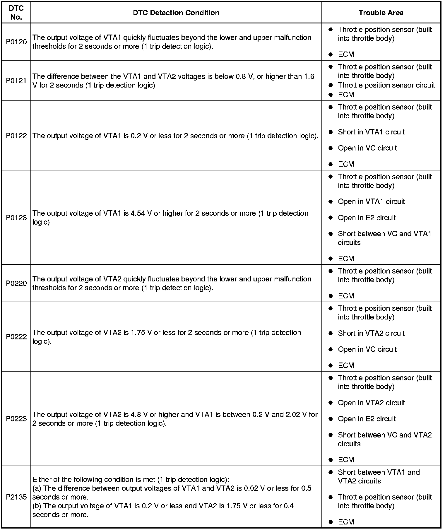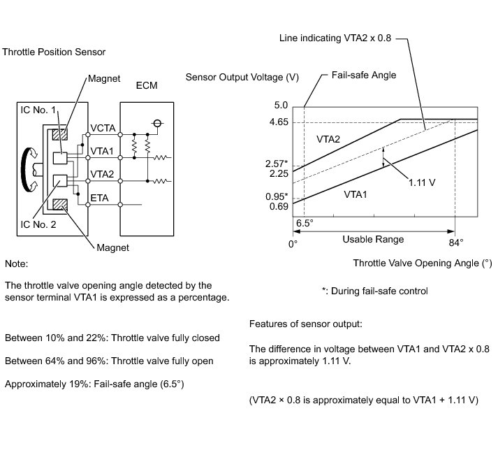 - A specific voltage difference is expected between the sensor terminals, VTA1 and VTA2, for each throttle valve opening angle. If the difference between VTA1 and VTA2 is incorrect, the ECM interprets this as a malfunction in the sensor circuit, and stores a DTC.