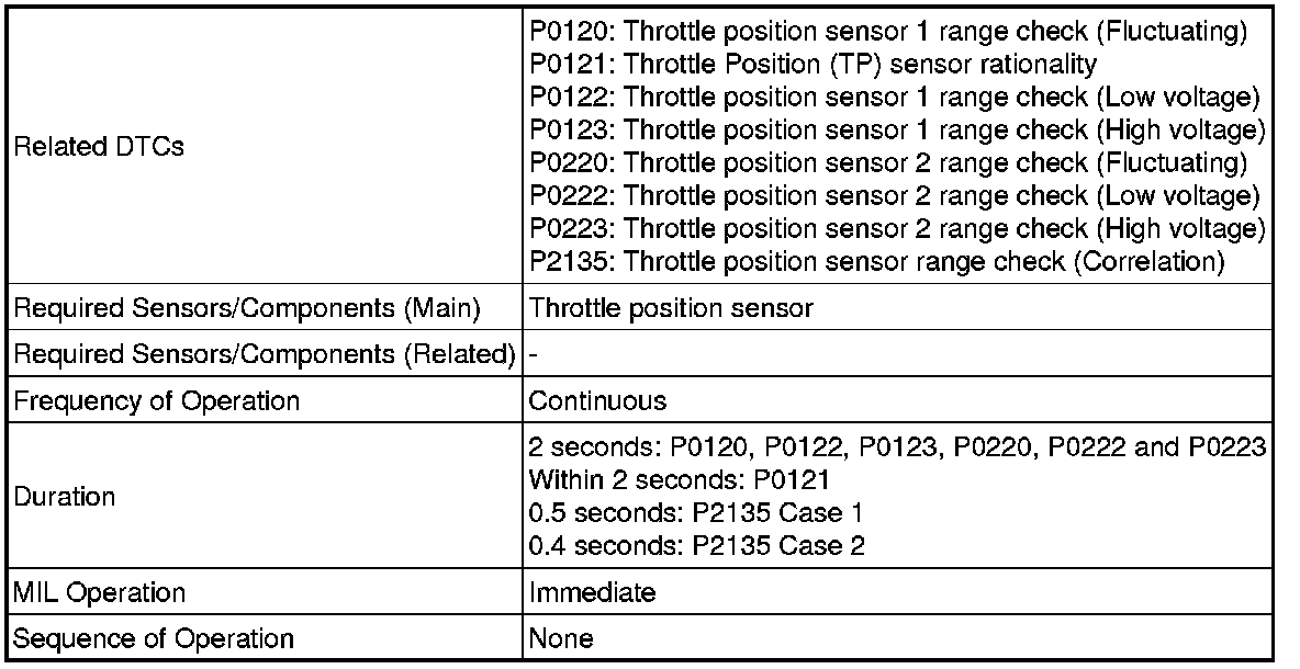The ECM uses the Throttle Position (TP) sensor to monitor the throttle valve opening angle. There are several checks that the ECM performs to confirm the proper operation of the TP sensor.