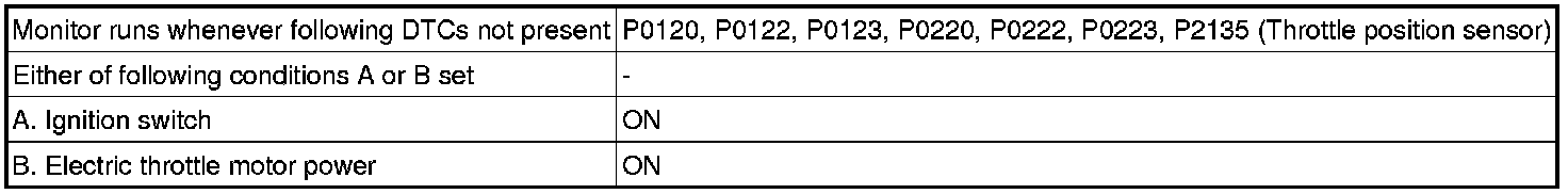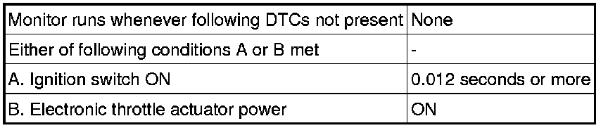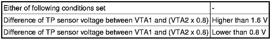For each throttle opening angle, a specific voltage difference is expected between the outputs of VTA1 and VTA2. If the output voltage difference between the two signals deviates from the normal operating range, the ECM interprets this as a malfunction of the TP sensor. The ECM illuminates the MIL and stores the DTC.