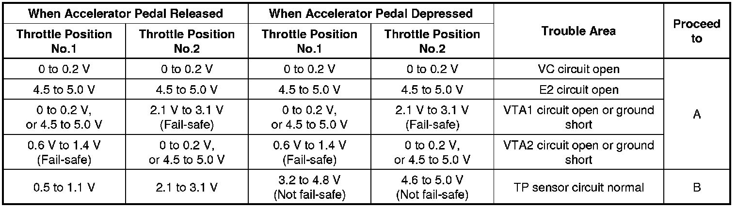 - VTA1 and VTA2 each have a specific voltage range. If VTA1 or VTA2 is outside the normal operating range, the ECM interprets this as a malfunction in the sensor circuit, and stores a DTC.