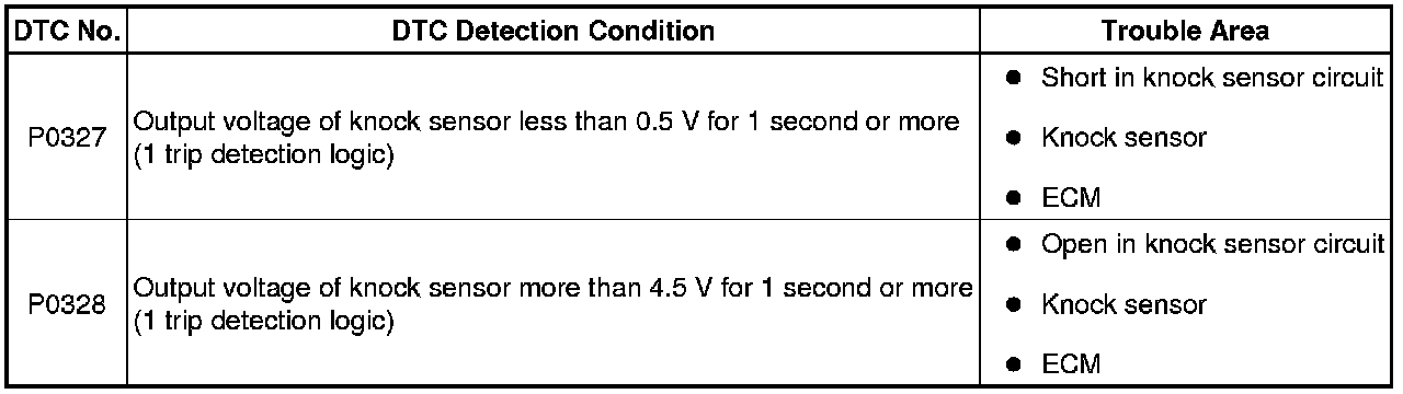 If the output voltage transmitted by the knock sensor remains low or high for more than 1 second, the ECM interprets this as a malfunction in the sensor circuit, and sets a DTC.