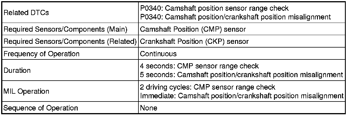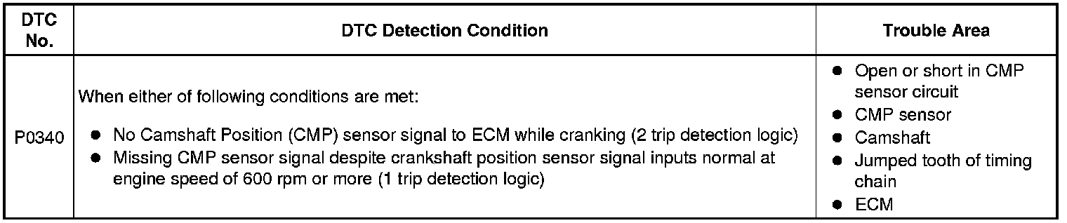 DTC P0340 indicates a malfunction relating to the CMP sensor circuit (the wire harness between the ECM and CMP sensor, and the CMP sensor itself).