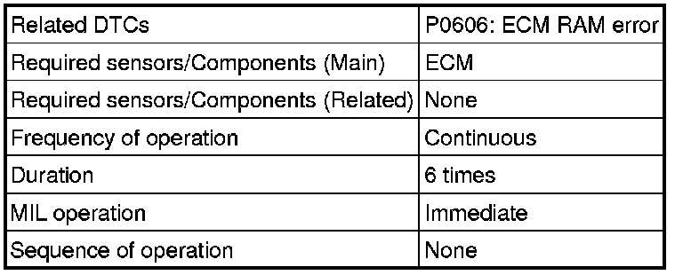 The ECM continuously monitors its internal memory status. This self-check ensures that the ECM is functioning properly. It is diagnosed by internal "mirroring" of the main CPU and sub CPU to detect the Random Access Memory (RAM) errors. If outputs from these CPUs are different and deviate from the standards, the ECM will illuminate the MIL and set the DTC immediately.