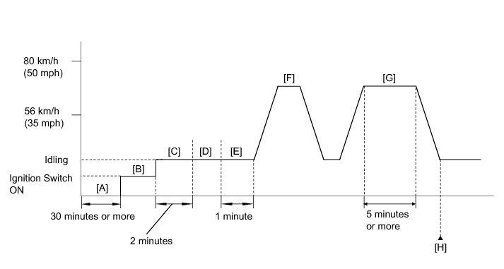 9. Drive the vehicle at 56 to 80 km/h (35 to 50 mph) for 5 minutes or more [G].