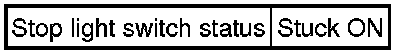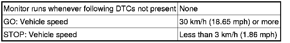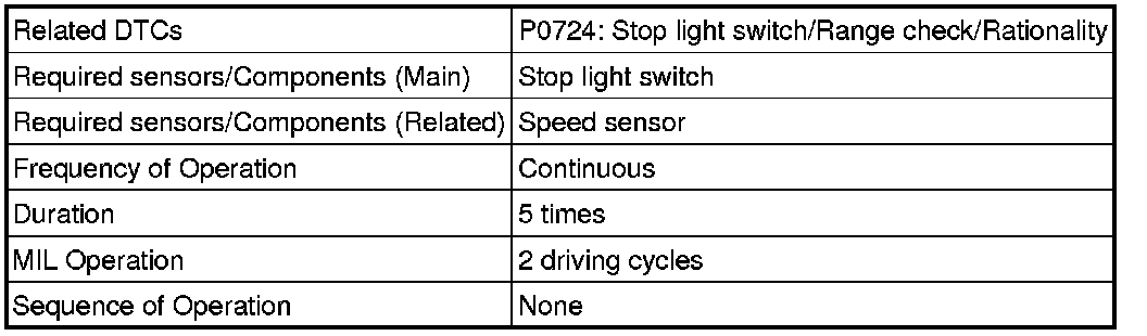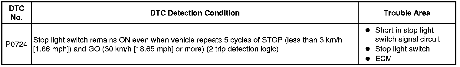 This DTC indicates that the stop light switch remains ON. When the stop light switch remains ON during "stop and go" driving, the ECM interprets this as a fault in the stop light switch and the MIL comes on and the ECM stores the DTC. The vehicle must stop (less than 3 km/h [1.86 mph]) and go (30 km/h [18.65 mph] or more) 5 times during 2 driving cycles, in order to detect a malfunction.