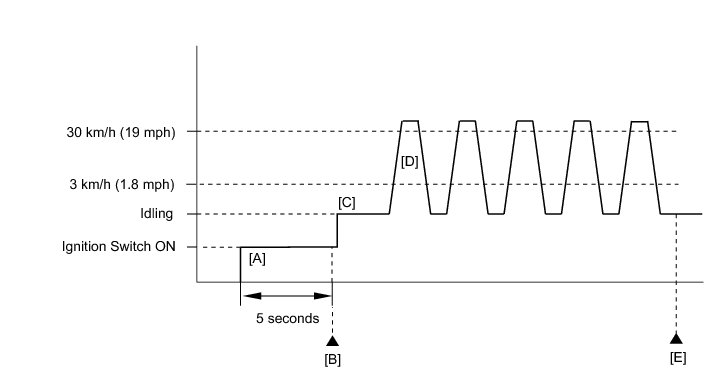 11. Accelerate the vehicle to 30 km/h (19 mph) or more, depress the brake pedal and decelerate the vehicle to 3 km/h (1.8 mph) or less [D]. Repeat step [D] 5 times.